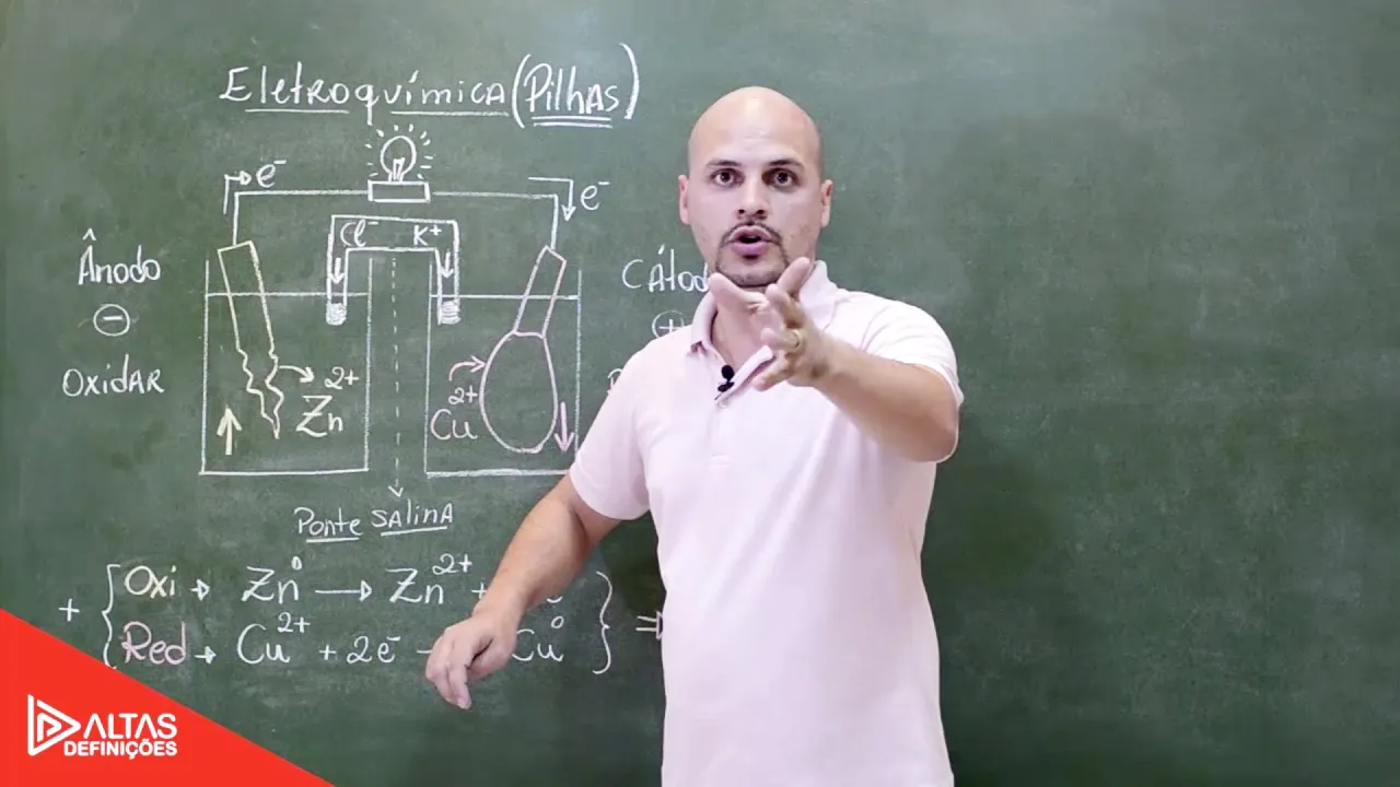 [Música] E aí fala Galerinha olha só Chegamos aqui mais uma vez para dar aquela dica especial para você que não tá nos acompanhando Repara bem vou falar de eletroquímica já ouvi falar de pilhas muito legal muita gente usa hein é importante falar de pilhas e baterias mas nosso foco aqui agora é pilhas para quem não conhece isso aqui é um esquinho de pilha de Daniel eu tenho aqui ó ó um lado chamado de anodo onde eu tenho alguém que vai sofrer uma oxidação e do lado de cá alguém que vai sofrer uma redução que eu