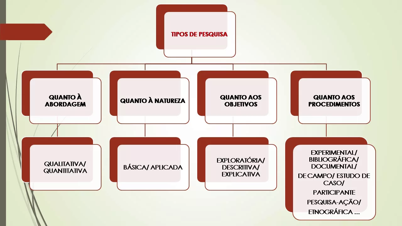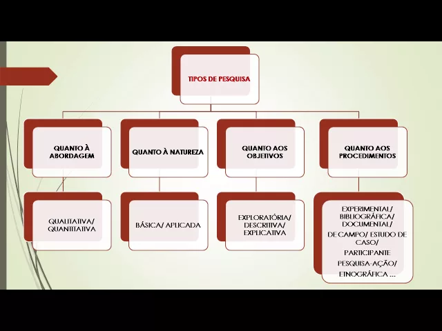 Olá caros cursistas estamos aqui novamente para a aula dois nós vamos abordar os tipos de pesquisa o nosso objetivo com esta aula é apresentar dos diferentes tipos de pesquisa quanto a sua abordagem a sua natureza objetivos e procedimentos os requisitos da pesquisa científica É apresentar resultados originais ou seja aquilo que a ainda ninguém estudou ou apresentou como dados outro requisito da pesquisa é que esses resultados não apresentem distorções e nem desvios tem que ser indicadas as fontes bibliográficas utilizadas e indicar com clareza os métodos utilizados tipos de pesquisa nós temos a pesquisa quanto a abordagem