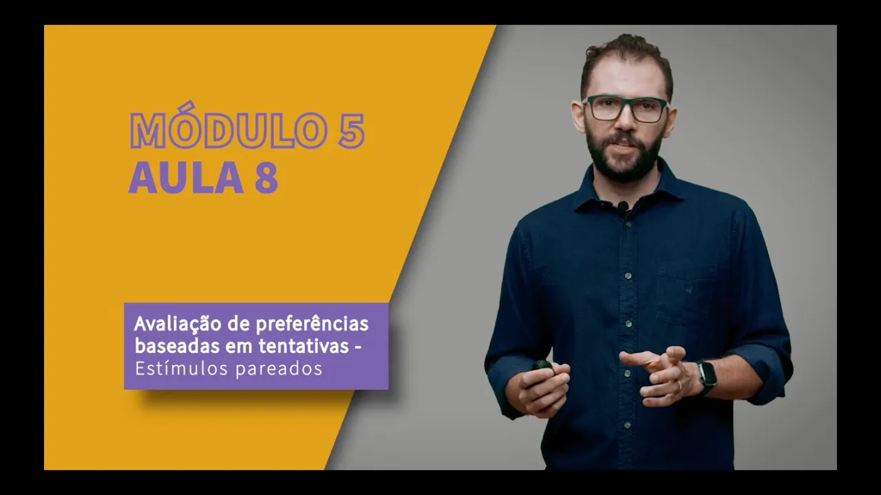 Módulo 5 Aula 8 Uma segunda estratégia de avaliação de preferências baseadas em tentativas é a de estímulos pareados. Nesse método de avaliação, dois itens estão presentes em cada uma das tentativas. Uma tentativa começa quando os objetos são colocados sobre a mesa, diante da criança, e a criança recebe uma instrução que é escolha um, ou escolha um brinquedo, ou escolha um objeto.