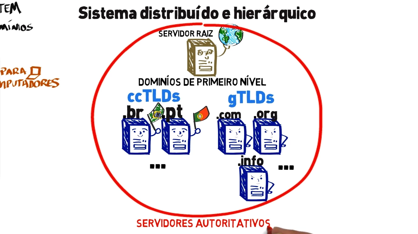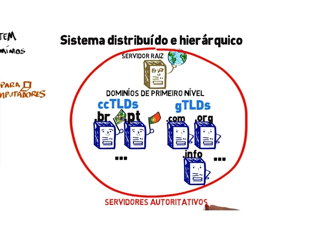 O DNS, na verdade, é um sistema distribuído e hierárquico. Temos, para começar, os servidores raiz, que têm as informações sobre as principais partes em que é dividida essa tabela, esse sistema de nomes: os domínios de primeiro nível. Há dois tipos de domínios de primeiro nível.