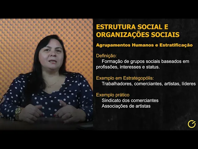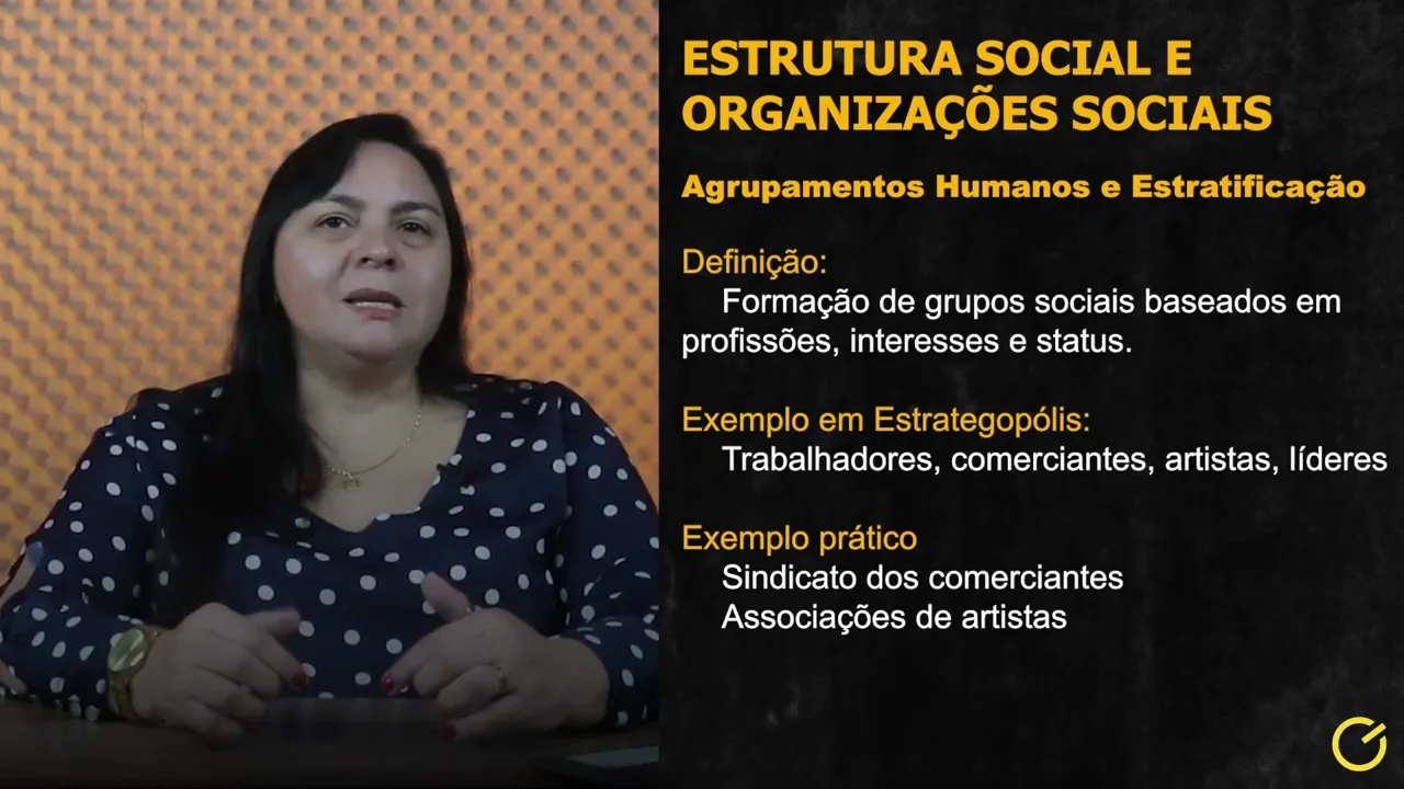 [Música] Olá, sejam bem-vindos e bem-vindas a mais uma aula sobre estudos socioantropológicos aplicados ao direito. Nas aulas anteriores, nós tratamos sobre estrutura social e organizações sociais, conceituando essas duas categorias. Posteriormente, fizemos uma narrativa de um contexto fictício da cidade de Strategis, e nesta última unidade abordaremos os agrupamentos humanos e a estratificação.