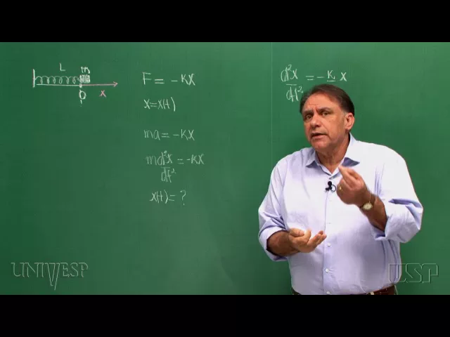 E é exatamente esse problema que nós queremos resolver. ou seja, como é que x depende do tempo quando, sobre essa partícula de massa m age uma força dada por esta expressão: F = -kx o eixo x está orientado de acordo com aquela figura. Ora, tendo em vista que esta partícula tem massa m, a Lei de Newton afirma que (leitura da lousa), ou, escrito de outra forma, nós escrevemos que (leitura da lousa) como, a partir desta equação, que é basicamente a 2ª Lei de Newton, eu posso determinar x como função do tempo (leitura da lousa) E esse é o problema que temos em nossas mãos.