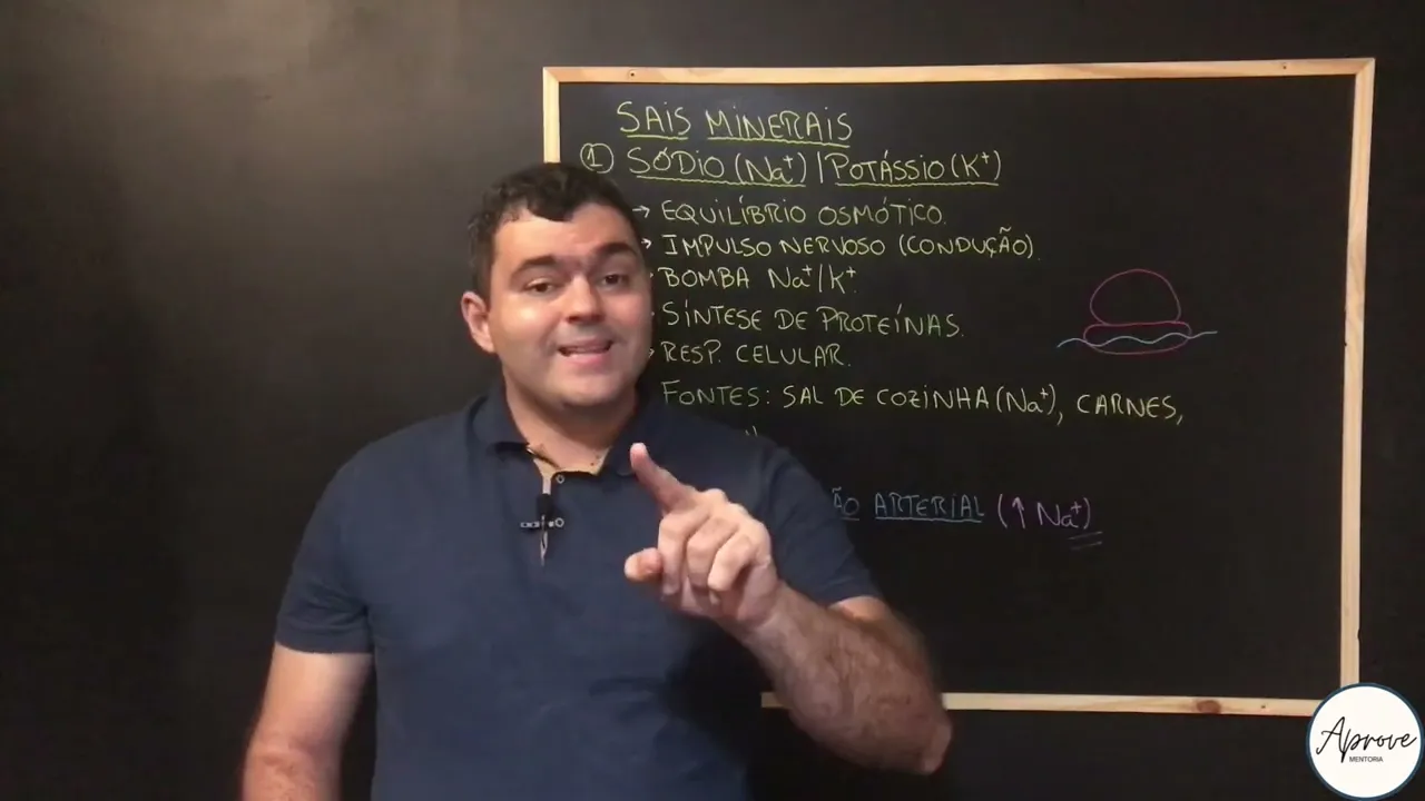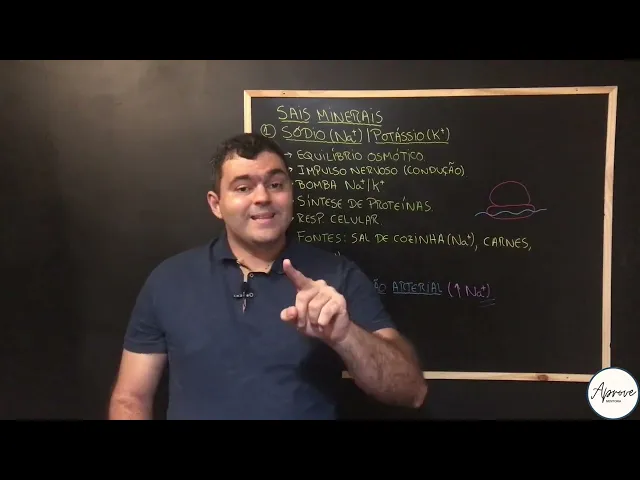 [Música] Fala galera ligado no projeto aprova e mentoria tudo bem com vocês Professor Pedro aqui na área professor de biologia dando continuidade aí ao nosso estudo sobre os sais minerais no vídeo anterior falamos aí uma introdução sobre sais minerais que eu recomendo você assistir Antes de Partir para esse vídeo aqui e nessa vídeo aula começaremos aí a falar sobre os sais minerais de fato e de cara dois deles muito importante são o sódio e o n a mais e o potássio iam ficar mais coloquei eles aqui como se fosse uma coisa só né coloquei os