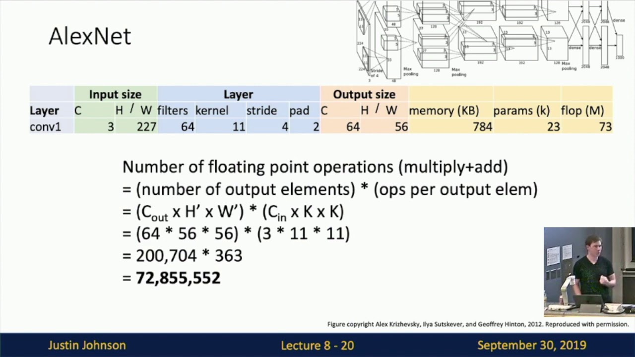 each of shape three by five by five so then if you multiply all that together you can see that this convolution operation takes quite a lot of multiply add operations in order to compute its output and also by the way this is Something that sometimes trips people up but one thing that's actually used sometimes is a one by one convolution where the kernel size is just one by one and this seems kind of weird but it actually makes perfect sense so for a one by one convolution we might have in this case a spatial input