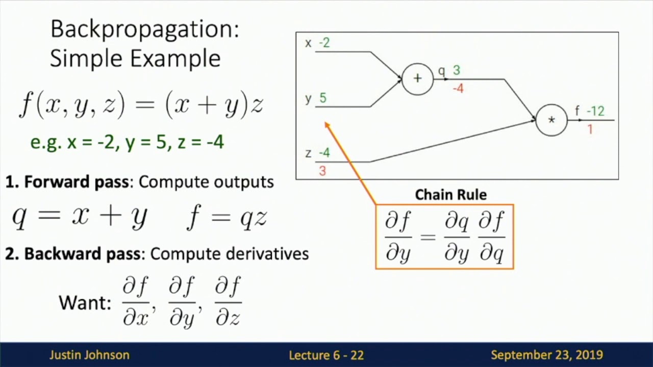 complex expressions instead we were able to compute gradients in expressions of arbitrary complexity by implemented by using the back propagation algorithm to walk forward over the graph and then the forward pass to compute the outputs and then walk backward over the graph in the Backward pass to compute the gradients and we had this local viewpoint of the back propagation algorithm where now in order to imp in order to add a function or use a function inside of a computational graph we needed to implement this little tiny local operator that would come that would know how