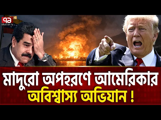 [মিউজিক] রাতের আধারে একের পর এক উঠছে আমেরিকার ব্ল্যাক হক হেলিকপ্টার। ভেনেজুয়েলার রাজধানী কারাকাসে উড়ে এসে নামে 10 থেকে 12 টি ব্ল্যাক হক আমেরিকান হেলিকপ্টার। হেলিকপ্টার গুলোতে ছিল আমেরিকান স্পেশাল ফোর্সের সদস্যরা। এরপর যা ঘটে তা হয়তো স্বপ্নেও কল্পনা করতে পারেনি বেশিরভাগ মানুষ। মাত্র কয়েক ঘন্টার মাঝে দেশটির প্রেসিডেন্ট নিকোলাস মাদুরো এবং তার স্ত্রীকে [মিউজিক] রীতিমত অপহরণ করে নিয়ে গেল মার্কিন যুক্তরাষ্ট্র। তারা কোথায় আছেন, কোথায় নিয়ে যাওয়া হয়েছে কিংবা আদৌ বেঁচে আছেন কিনা সে নিয়ে চলছে বিস্তর আলোচনা সমালোচনা। শনিবার কারাকাছে তখন মধ্যরাত। [মিউজিক] দেশের আকাশে সন্দেহজনক বিমানের আনাগোনা। খুব নিচু দিয়ে উঠছিল বিমানগুলো। হঠাৎ করে সামরিক স্থাপনাসহ বেশ