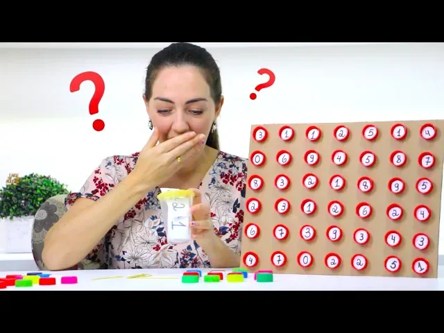 na sua vez irá jogar o dado visualizar a quantidade que caiu e marcar com o seu elástico no tabuleiro [Música] no final quando não houver mais elásticos em mãos cada jogador irá contar quantos pontos marcou você pode realizar com crianças a partir dos 4 anos com a terceira atividade nós vamos trabalhar o conceito de a direção faça 42 círculos de papel e escrevi os numerais de 0 a 9 várias vezes encaixe ou colhe os dentro das tampinhas faça também fichas com o resultado de alguns cálculos tudo pronto agora é só iniciar a atividade a criança