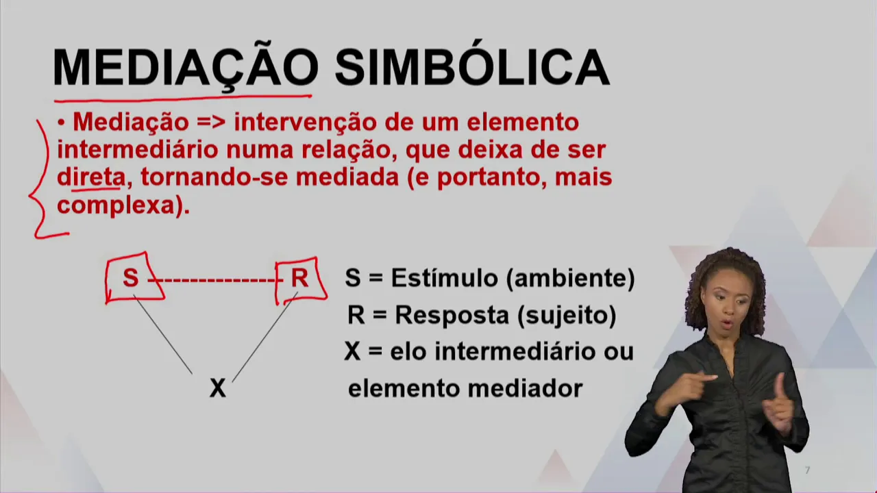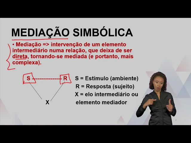 ESSA MEDIAÇÃO ENVOLVE SEMPRE A INTERVENÇÃO DE UM ELEMENTO INTERMEDIÁRIO NUMA RELAÇÃO QUE DEIXA DE SER DIRETA, ENTÃO NÃO É MAIS ESTÍMULO RESPOSTA, ENTÃO A RELAÇÃO NÃO É MAIS DIRETA, ELA DEIXA DE SER DIRETA PRA SOFRER A INFLUÊNCIA DE ALGO E ESSE ALGO PODE SER UM SIGNO, PODE SER ALGO QUE FAÇA PARTE DA CONSTITUIÇÃO, POR EXEMPLO UM LIVRO PODE SER ALGO QUE FAÇA A MEDIAÇÃO. NESSE PONTO A GENTE NÃO ESTÁ DESTACANDO SÓ A IDEIA DA MEDIAÇÃO COMO PESSOA, MAS QUALQUER ALGO QUE VAI INTERFERIR NA MINHA RELAÇÃO COM O OBJETO DO CONHECIMENTO. E É ESSE ELO, ESSE ELO INTERMEDIÁRIO QUE É O “X”, É O ELEMENTO MEDIADOR.