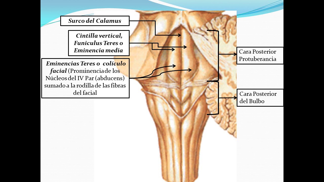 cerebros a través de los perú los cerebelo sos medios que son los que nosotros estamos viendo ahí en la imagen ok entonces hasta acá abajo vemos al surco que les estoy diciendo que lo separa el bulbo raquídeo que es el surco punto vulva de un módulo con tim o como le quieran decir y hacia arriba a nivel de la fosa interpreta ocular vemos al famoso surco punto mes encefálico muy bien vamos a hablar ahora de las caras de las caras que me componen a este puente así como cuáles son sus estructuras internas pero antes no