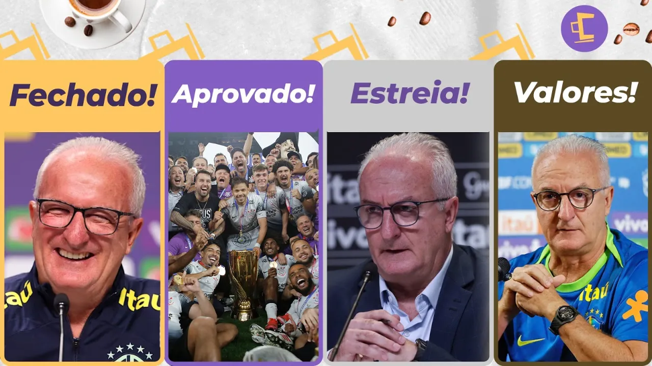 Dorival aprovou o elenco corintiano, acha top o elenco, mas vai ganhar reforços. Vamos também falar dos valores da transação, quanto o Dorival vai receber para treinar o Corinthians e também o dia da estreia, claro, de Dorival Júnior. Tudo isso agora nesse blende de informações.