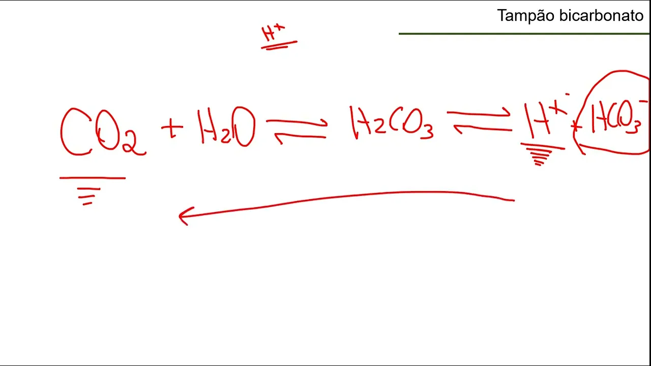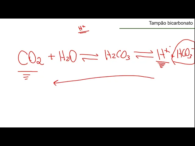 ir para o outro lado tá então o que que acontece né como é que pode então essa reação se a reação do nosso sistema tampão se como nós geramos muito CO2 Nós também geramos muita hidrogênio acontece que esse hidrogênio quando necessário ele vai ser temponado pelo bicarbonato né ou seja eles vão se ligar e aí a reação vai se deslocar para esquerda tá então quando a gente produz muito CO2 a reação se desloca para a direita e conforme aumenta h+ no meio essa ele vai ser legal O bicarbonato e essa reação vai colocar para esquerda