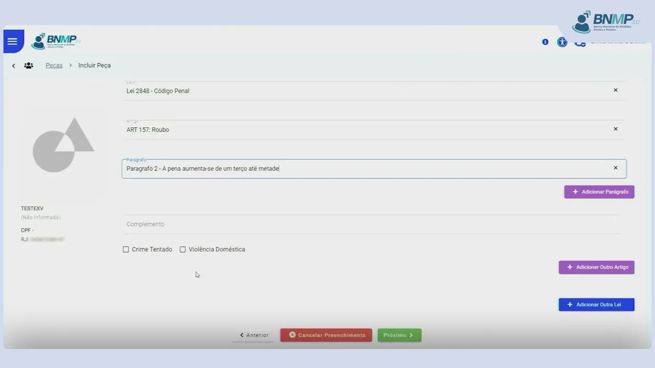 de internação como conversão de prisão em indique o mandado de prisão o tipo de sigilo o local da ocorrência caso conhecido e o prazo da duração mínima da internação e clique em próximo em tipificação p ai o artigo e o parágrafo se hver e em crime tentado e violência doméstica marque o checkbox que se adequa ao caso concreto se for necessário acrescentar outro crime previsto na lei anteriormente digitada u o botão mais adici outro artigo outro crime previsto em lei diversa utilize o botão mais adicionar outra lei clique em próximo em síntese da decisão Lance