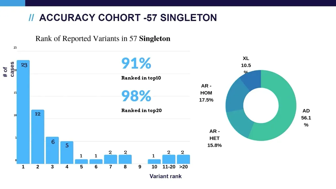 diagnosis variance and the percentage of the cases that was captured by the top 10 ranked variants and and also later we'll talk about our clinical production cohort including the validation implementation and our experience with 334 clinical cases we also look at the automated re-analysis possible in the last slide so our accuracy cohort um is quite similar with our production cohort so it is a good representation of our real clinical work the only exception the only difference between accuracy could harm production cohort is that um and the accuracy cohort is all positive cases while the production