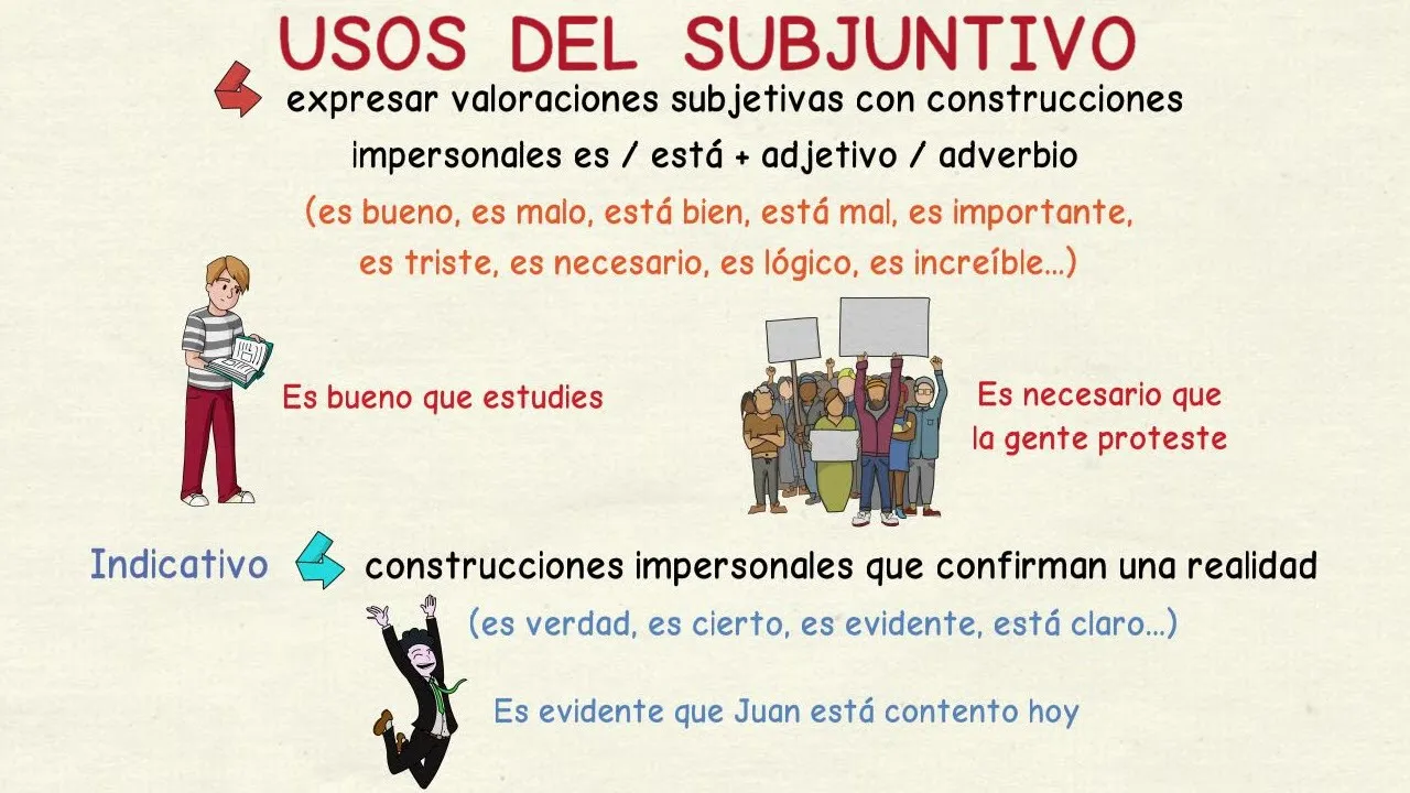 También usamos el subjuntivo para expresar gustos, sentimientos y emociones con verbos como gustar, encantar, alegrarse, odiar, sentir, preferir, sorprender, temer, dar miedo o preocupar Odio que la gente fume Me preocupa que le haya pasado algo malo En estos dos casos (expresar deseos y sentimientos) solo usamos el subjuntivo tras la conjunción ‘que’ si hay dos sujetos diferentes en la oración principal y en la subordinada Pero usamos infinitivo sin que si la oración principal y la subordinada tienen el mismo sujeto Quiero que pasees al perro distinto sujeto quiero -> yo pasees -> tú por eso va que + subjuntivo Quiero pasear al perro mismo sujeto quiero -> yo pasear -> yo por eso va infinitivo sin que Le gusta que bailemos distinto sujeto le gusta -> a él bailemos -> nosotros Le gusta bailar mismo sujeto le gusta -> a ella bailar -> ella En mi libro de Verbos puedes hacer ejercicios sobre el subjuntivo y el resto de los tiempos verbales El subjuntivo también se usa en español para expresar valoraciones subjetivas con construcciones impersonales formadas por es o está + adjetivo o adverbio es bueno, es malo, está bien, está mal, es importante, es triste, es necesario, es lógico, es increíble. . .