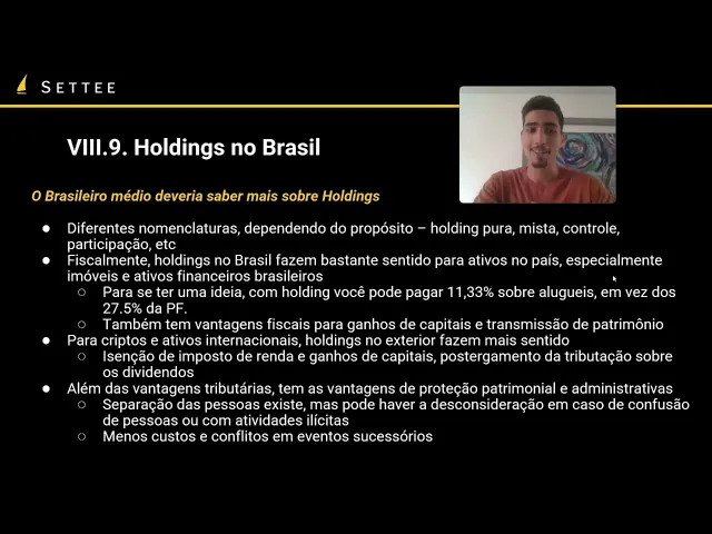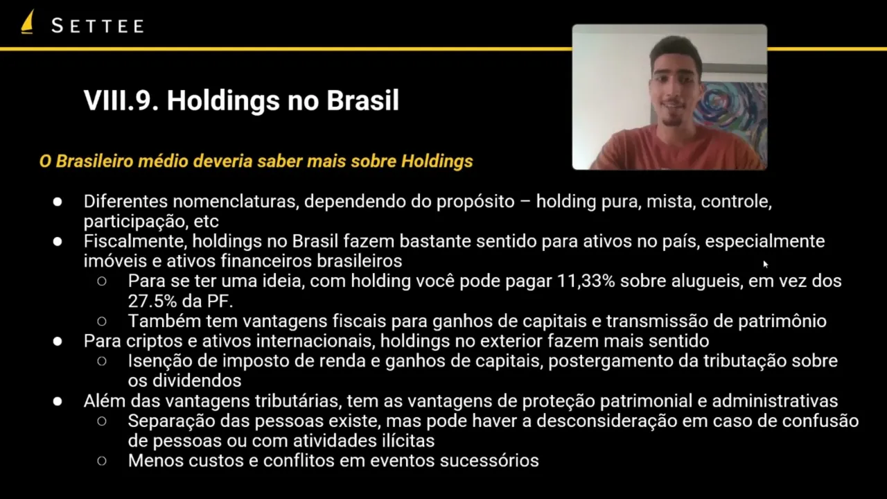 mas de forma geral a gente está falando de uma empresa que é para manutenção de ativos para gestão administração e crescimento de ativos fisicamente a nível de impostos as Rodes no Brasil fazem bastante sentido para ativos no país então especialmente falando de imóveis brasileiros e também de ativos financeiros no Brasil investimentos participações em outras empresas etc então para ter uma noção né da economia que você pode ter com a holding você vai pagar aí potencialmente até 11.33% de imposto sobre aluguéis em vez dos 27 e meio que você vai ter recebendo aluguel na pessoa física