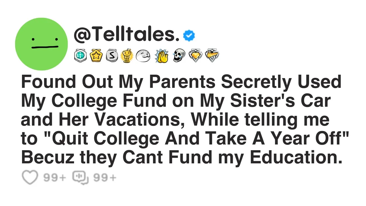 found out my parents secretly used my college fund on my sister's car and her vacations while telling me to quit college and take a year off because they can't fund my education my younger sister Viv recently graduated from high school however this hasn't been a straightforward Journey For Her by any means in fact she has failed High School twice before and this was her third attempt you see Vivi has always struggled academically from a young age school was never her strong suit and she found it extremely difficult to keep up with with her peers it