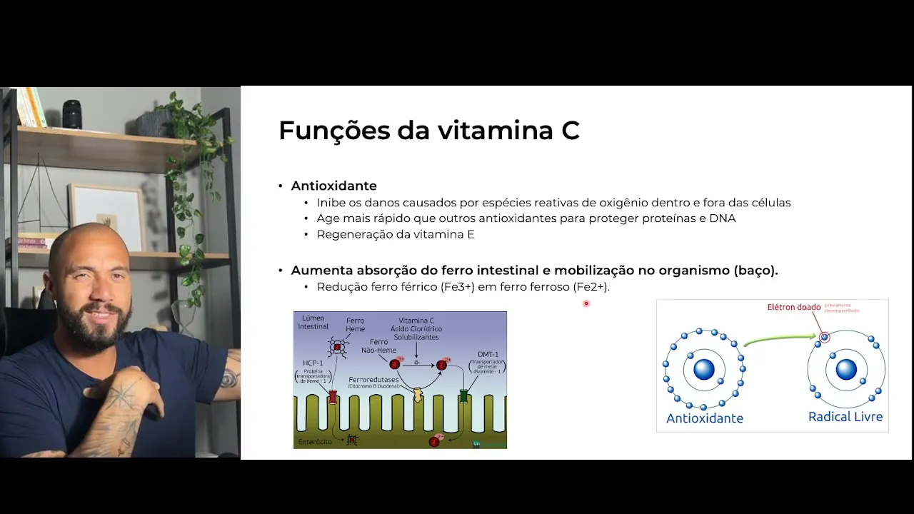 Olá tudo bem seja muito bem-vindo aqui a mais uma aula nessa aula nós iremos falar sobre a vitamina C o ácido ascórbico uns um nutriente importante que é muito comercializado como suplemento né pouco prescrito na verdade mas muito comercializado né não é comum a gente ver profissionais médicos ou nutricionistas prescreverem vitamina C mas sempre que você vai numa farmácia você percebe que a vitamina C é muito vendida né em em cápsula pervers com intuito de prevenir e tratar resfriados Tá mas nessa aula a gente vai entender o que qual o papel da vitamina C em