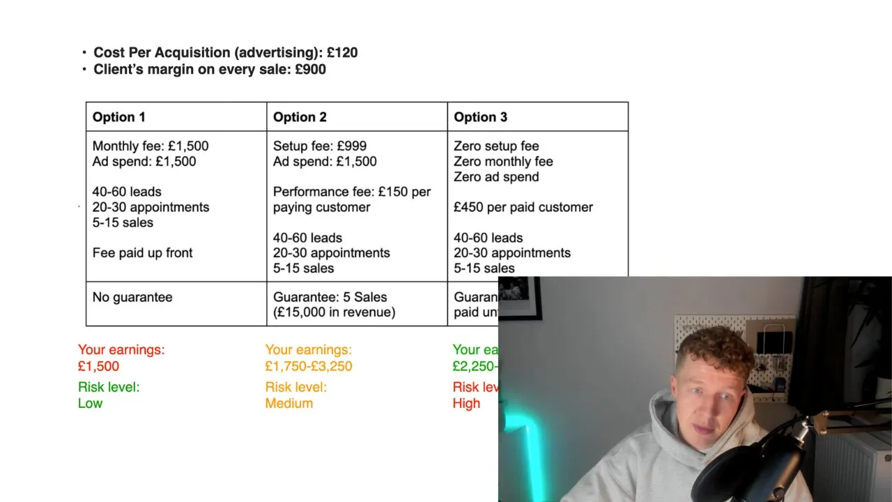 hi guys how's it going it's Sam here and welcome to another video as you can see by this title in this video I'm going to be giving you guys the exact formula for creating offers for marketing agencies that sell not only allowing you to charge a heck of a lot more money but also it's going to give you a far better chance of your potential clients saying yes to your offer and we're going to talk about no-brainer offers guarantees pricing structures how to charge how much to charge how to craft the perfect offer and for those who don't know um this video or this topic is taken from my last newsletter article that I wrote which came out a couple of days ago I think so um if you guys want to get excuse me if you guys want to get in-depth um you know versions of these particular videos and potentially more content as well um it's free it's always going to be free you guys can sign up for my free newsletter it's called agency Club um so yeah just head to the link in the description if you guys want to see more long phone content more description content so I've got three articles I've written recently one is about um my top resources one is about how to pick a niche for your marketing agency and go through a formula um similar to the one in my last video about how to kind of figure out your Niche and how to just find niches that are more profitable for you more profitable for you give you more chance success and I give you my secret formula on how to do that and yet the last one which was five days ago actually was the topic which we're going to cover in this video is we're going to talk about how to create offers for your marketing agency so those who don't know my name's Sam myself and my business partner um started the marketing agency in the Home Improvement space here in the UK about three years ago we've done over two million pounds in sales we do anywhere from 50 to 75 80 000 pounds a month in Revenue we have anywhere from 25 to 40 clients any one time and we do a whole com a whole lot of testing with pricing and offers and a lot of that is what I'm going to be going through in this video so I've kind of put together a little keynote um which kind of goes through my top thoughts my main thought sorry around this topic so I'm going to play it and just go through it step by step I'm just going to put it down so you guys can see my face and hover this myself um up here in this corner so we can see okay so we're going to talk about how to create the perfect no-brainer offer for your marketing agency um and I've got a few things here which I think you guys are going to find quite interesting so the first rule about offer creation for agencies is you're not selling a service you're selling a solution of some sort you're selling an outcome you're selling of fixing a problem that your ideal customer or Prospect has so you're not selling Facebook ads you're not selling Google ads you're not selling website design you are selling a solution okay and you need to understand that in 2022 if you're not some form of Performance Based agency you're not going to succeed you're going to find it much much harder to start out um you're not Ogle the app you know you're not Ogilvy you don't have you know decades or Decades of experience and PR and you don't you want you have your foot in the door with massive corporations therefore you need to be solving some sort of problem that your idle customer has um so you need to get in your head you're not selling a service you are selling a solution that's tool number one um and I have two examples here so agency one um their offer is 10 hours of time per month for 100 pounds an hour now this is how it used to be years ago like you know 10 20 years ago this is how people sold Services um and Wendy you know the birth of Web 2. 0 when websites were a new thing this is what people sold now it doesn't work anymore it's too much competition out this should agency too but HD2 um their offer is 20 000 sales and 30 days guaranteed for a thousand pound investment now which one are you going to choose it's pretty obvious um and it doesn't matter whether this company does Facebook ads email marketing Google ads social media posting free report it doesn't matter what they do this is always going to be more compelling and the end user doesn't care as an agency owner if an agency comes to me and says hey I'm going to get you 20 appointments a month with Executives of 5 to 50 million pound a year um construction companies and you're going to pay me 300 to 500 pounds for every booked appointment that I give you and you don't pay if I don't give you any I'm not going to go and say hey how are you generating them are we using Facebook ads or using Google ads and may ask these questions but ultimately I don't really care because the offer's still there and the offer is really really good so no one cares um and I've given you one more example here which is uh roofing for example this is kind of you know we don't do exclusive anything but like just it's something I understand so old model might have been Woods on your website we'll set up your Facebook ads we'll get you one to five thousand website views a month we'll get you we'll give you a weekly checking call with one of our top level exec you know top level um managers free logo design free month minimum commitment zero guarantees because no one can guarantee anything um and it takes 14 days to get set up and we charge you a thousand pounds a month loads of services right amazing only four thousand pounds crazy the new model though which will you tell me which one's gonna sell better here's what you get as a roofer 25 Book Sales appointments per month you only pay for confirmed appointments zero contracts five guaranteed confirmed rereovs a month with deposits paid a minimum of 20 000 pounds in sales we deliver your leads within 20 So within 72 hours but our price is two and a half thousand pounds a month which one do you think a r