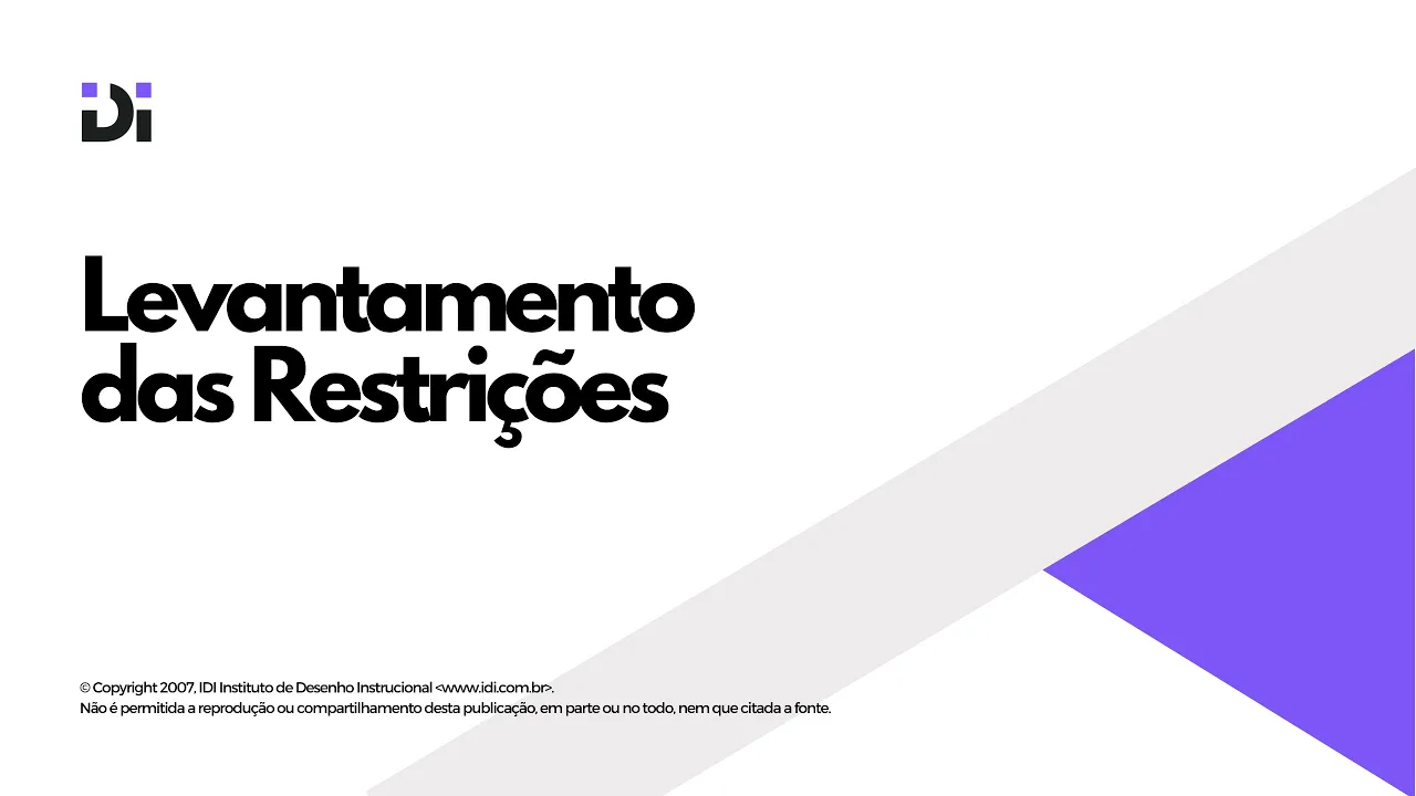 Olá boas-vindas nós já falamos sobre o levantamento das necessidades de aprendizagem nós conversamos sobre o levantamento das características do público alvo né sobre a importância de conhecer os nossos alunos e agora nós vamos conversar sobre o levantamento das restrições que com certeza é uma etapa importantíssima no processo de design instrucional porque eh nos ajuda aí a identificar e a compreender as limitações os desafios e os obstáculos que podem aí influenciar o desenvolvimento e a implementação das estratégias de de de Formação né do Design das ações de Formação que nós estamos aí investindo é basicamente uma