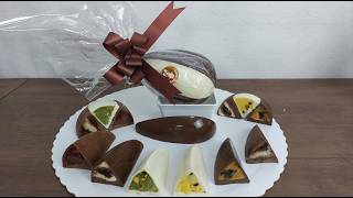 E se tem tendência de Páscoa, é claro que tem conteúdo aqui no canal, conteúdo completo, aonde você irá encontrar todas as informações necessárias, como quantidades exatas de chocolate, recheio, dicas para você economizar no seu produto e toda a minha precificação. E nesses ovos fatias, eu não utilizei o blister, pois ele encarece mais o meu produto. E é claro que eu vou trazer dicas aqui para você fazer o ovo inteiro sem o blister.
