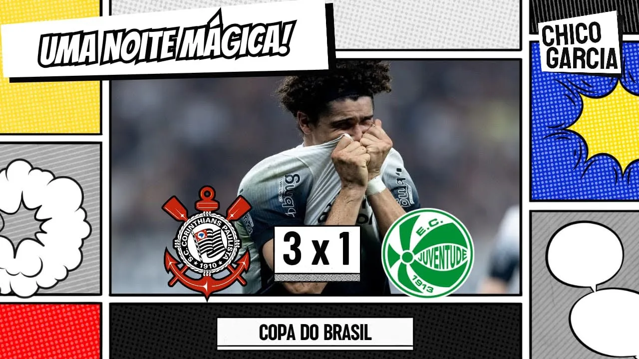 Corinthians continua criando chances continua chegando mas aí o Juventude o Juventude sai pro jogo e quando ele sai pro jogo encontra os espaços e encontra também um Hugo Souza um pouco instável eh eu tava preocupado até do jogo indo na pra decisão por pênaltis porque o Hugo poderia se consagrar porque na verdade ele tem sido decisivo nesse sentido mas não era a noite do Hugo e e olha que eu acho que a arbitragem errou e feio nos dois lances mas ele tava um pouquinho instável pelo menos um degrau abaixo do que a gente costuma esperar
