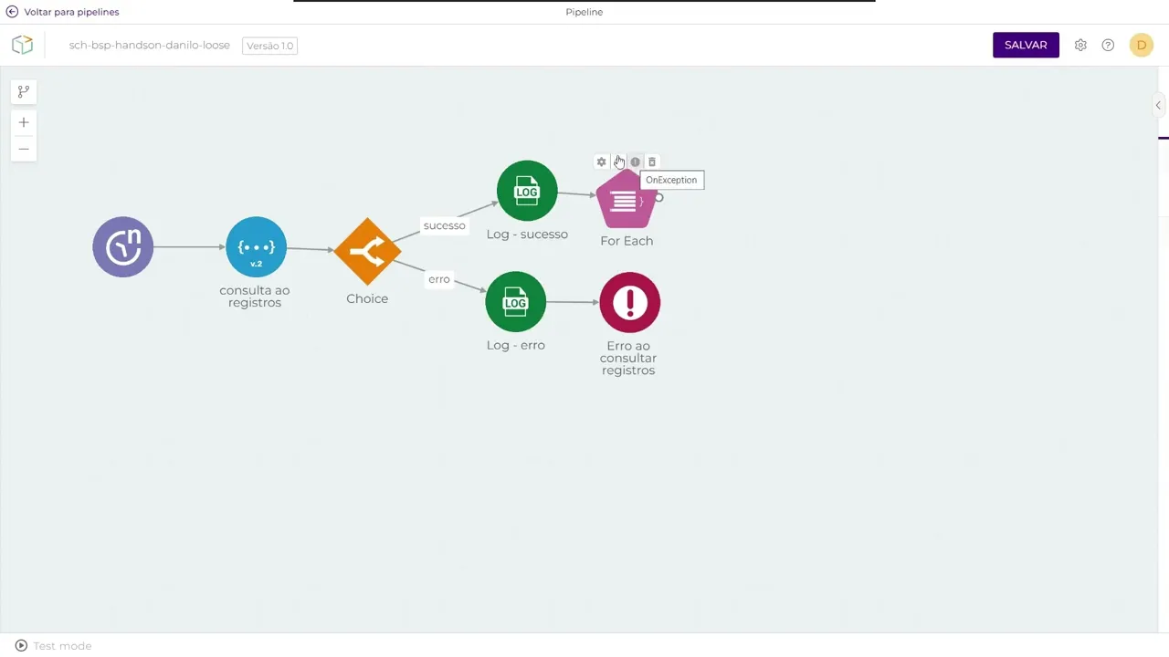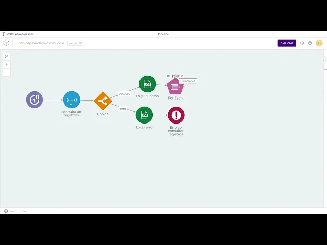 no vídeo anterior começamos a a criar o nosso fluxo estamos Fizemos a parte um Ron o que foi feito foi buscar registros de um sistema A então aqui buscamos os registros de sistema a por meio do H V2 ele nos retornou dados fizemos uma validação a chamada externa que é uma boa prática de desenvolvimento e logo depois de fazer uma validação nós colocamos no caso de erro uma interrupção do fluxo com um erro padronizado e para o caso de sucesso nós vamos continuar o nosso fluxo Então agora que nós conseguimos fazer essa primeira parte devemos