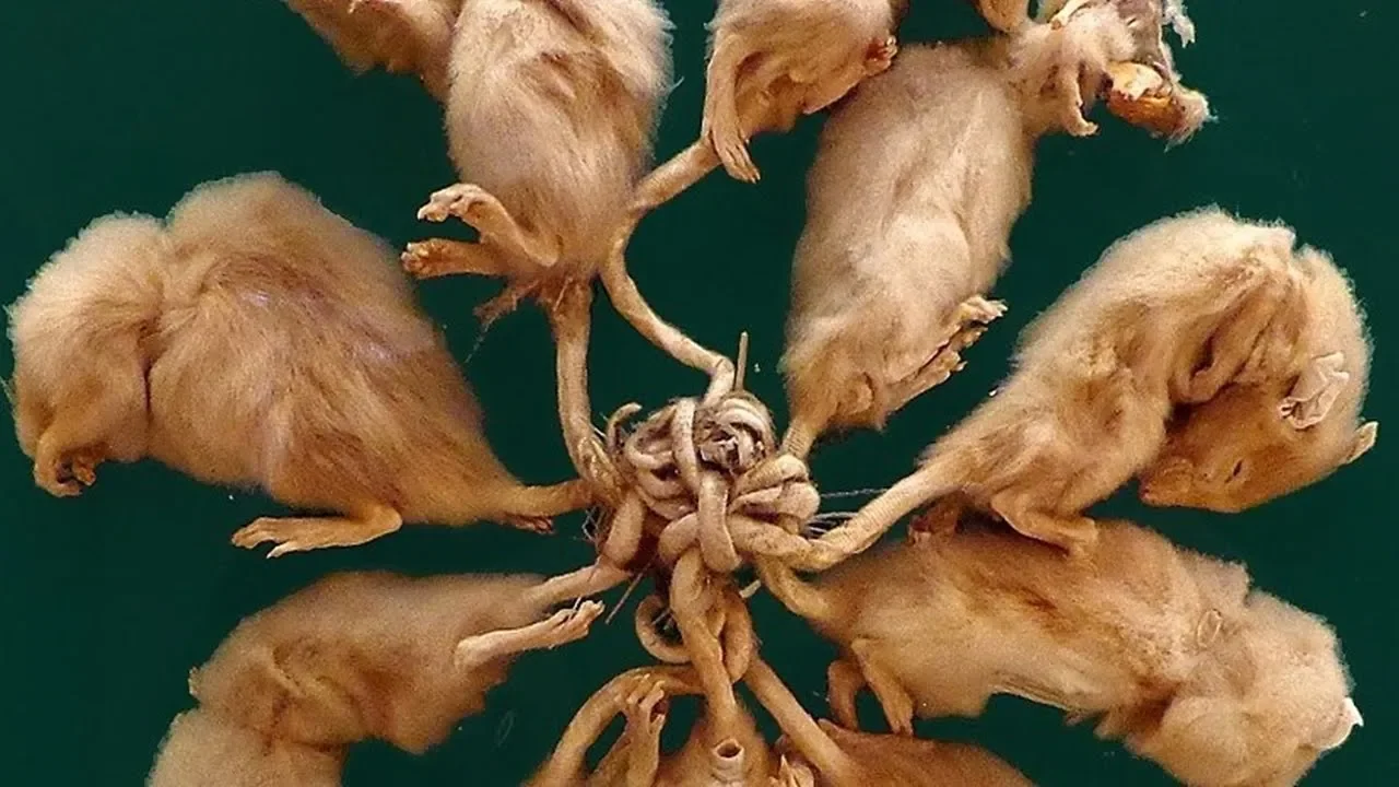 um monstro saído de algum folclore distante correto mas não não é isso é o que chamamos de rei dos Ratos e existem alguns espalhados pelos museus mundo afora em resumo rei dos Ratos é uma aglomeração de vários ratos que geralmente acontece durante uma proliferação uma infestação quando muitos ratos estão confinados em algum lugar pequeno existe uma chance de isso acontecer porém realmente é um fenômeno muito raro e nenhum cientista até hoje explicou porque e como acontece de fato Existem várias teorias a teoria de que durante o frio os ratos se reúnem para se aquecer e