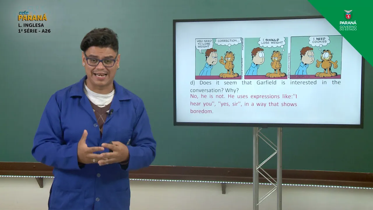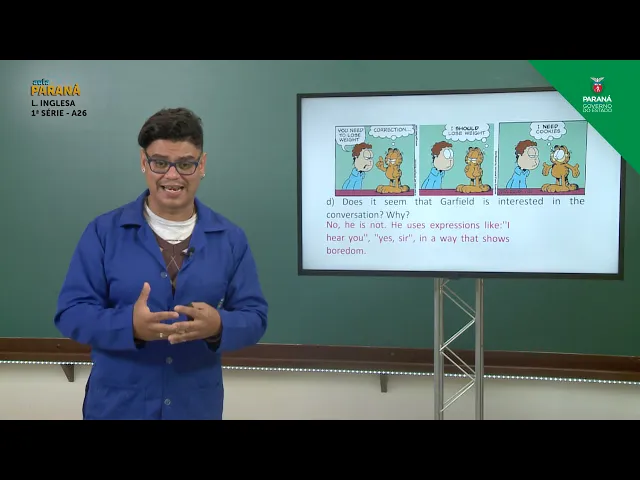 e não leva onde Espero que todos vocês sejam bem eu sou professor Silvio e vamos começar a nossa aula de hoje falando sobre tirinhas do Garfield Vamos aprender aumentar ampliar o nosso vocabulário criar o nosso léxico através das tirinhas do Garfield primeiramente Vocês poderiam me dizer vocês costumam é costume de vocês lerem tirinha ou os times eram muito comum sempre nos jornais impressos mas temos alguns sites algumas páginas de internet que sempre que trazem e o garfo Eu tenho um personagem muito comum muito conhecido que está aí Alguns anos frente as tirinhas ok com qual