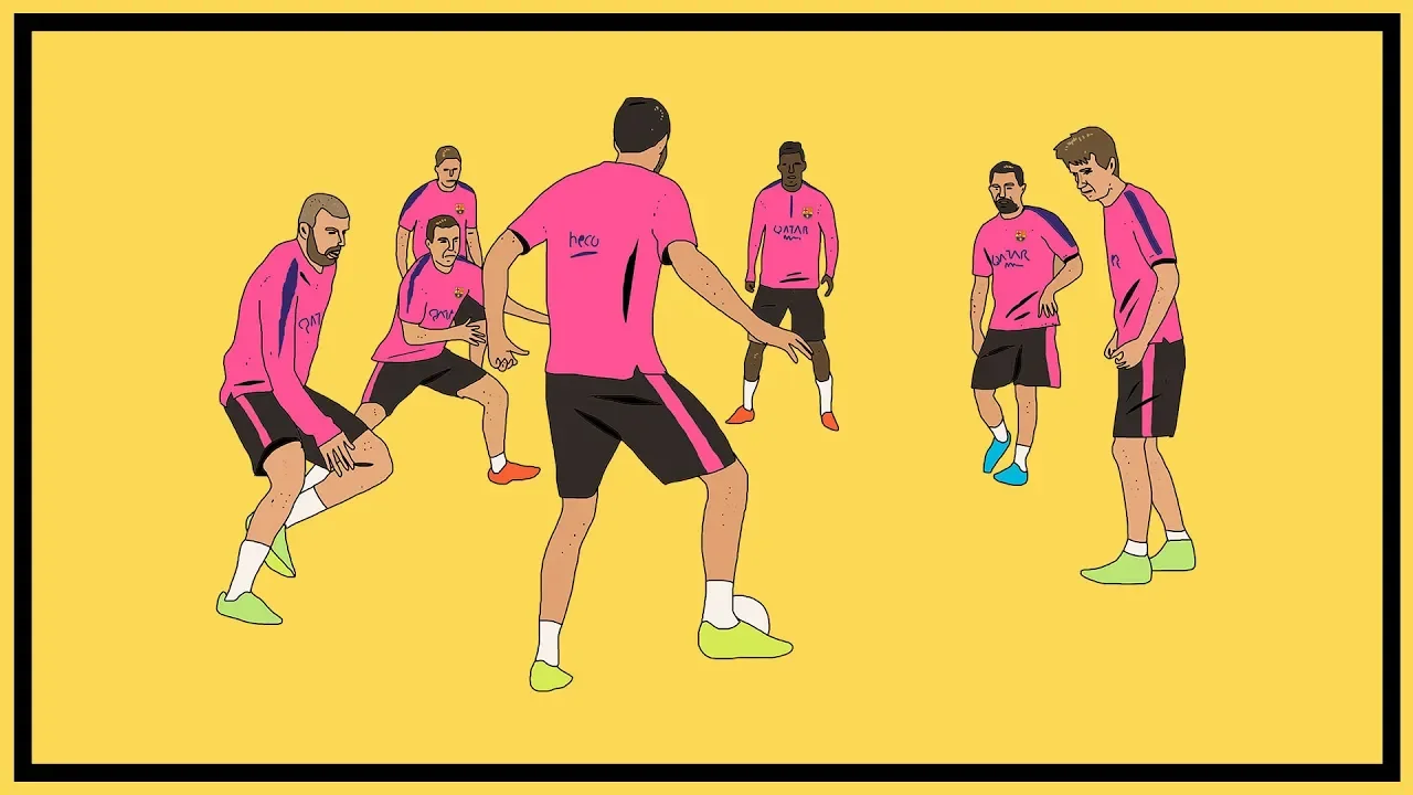 game of piggy in the middle only played with the feet and with almost inconceivable levels of technical proficiency most commonly Guardiola uses an 8 vs. 2 Rondo eight players stand in a circle and attempt to pass to each other while the two in the middle aim to dispossessed them it's a simple drill but one that has proved highly effective the goal of the players on the outside of the circle is to reach a target usually 30 passes if one of the players in the middle retrieves the ball the drill restarts and the man responsible for