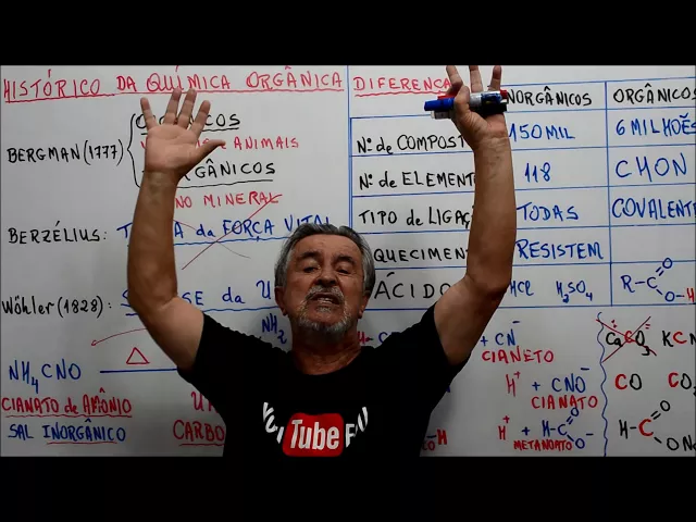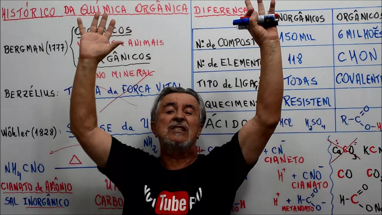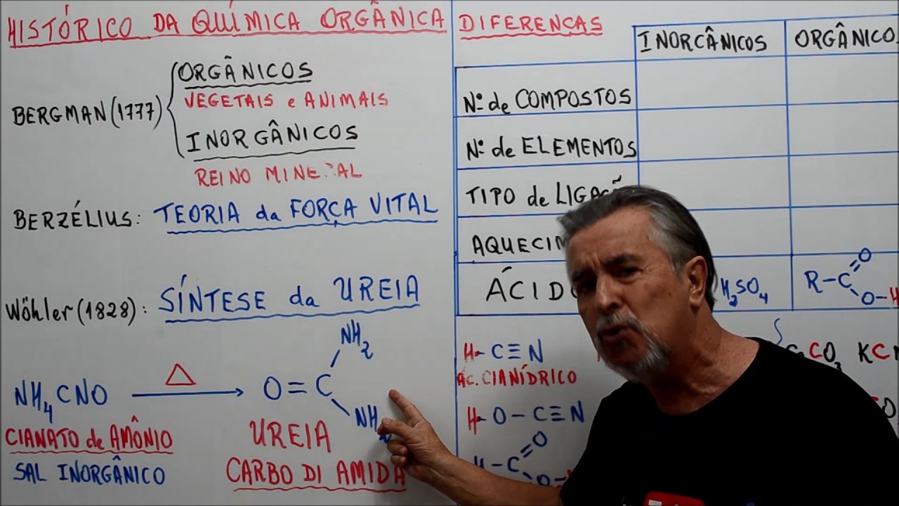 [Música] o histórico da química orgânica nos confirma que no início se pensava que os compostos orgânicos eram de origem animal e vegetal em service vídeos numa experiência de laboratório muito importante feita por vôo em 1928 sem conseguiu um composto orgânico a famosíssima uréia a partir de um composto e inorgânico então a necessidade de ter ligação com a vida acabou com a síntese da alemanha ao sintetizar urêia sem o processo metabólico animal provou se que o composto ela pode ser produzido de outra forma de outra origem e passou se a ter o conceito atual com os