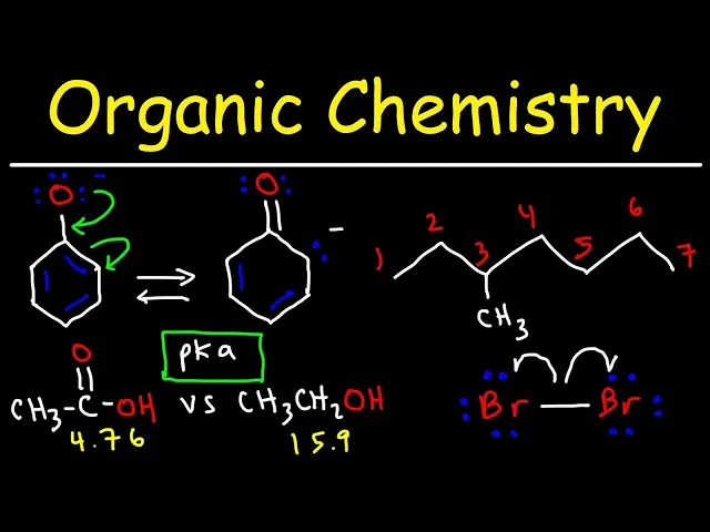in this video we're going to talk about organic chemistry now this video is for those of you who are taking the first semester of organic chemistry in college organic chemistry focuses on organic compounds compounds that contain carbon atoms now carbon likes to form four bonds but you also need to know the number of bonds that the other elements like to form so elements in the first group of the periodic table like hydrogen they like to form one bond beryllium for example likes to form two bonds boron which has three valence electrons it likes to form three bonds carbon has four valence electrons carbon likes to form four bonds nitrogen nitrogen likes to form three bonds in organic chemistry oxygen likes to form two and elements like fluorine and the other halogens chlorine bromine iodine they like to form one bond now there are cases where chlorine bromine and iodine conform seven bonds but we're really not going to cover that in this video i do have another video on title lewis structures which goes into that detail for those of you who might be curious now understanding that this is important because it helps us to draw lewis structures so for instance let's say if we want to draw the lewis structure of water h2o knowing that oxygen likes to form two bonds and hydrogen likes to form one we can start with a structure that looks like this now oxygen likes to have eight electrons each bond represents two electrons so that's a total of four to get to eight we need to add two lone pairs so that is the lewis structure for water now the bond between hydrogen and oxygen is known as an h-bond or a hydrogen bond which is a special type of covalent bond hydrogen bonds occur whenever h is directly attached to nitrogen oxygen or fluorine hydrogen bonding explains why water has such a high boiling point now let's say if we have methyl fluoride how can we draw the lewis structure for that molecule so we know that carbon likes to form four bonds so we're going to put that in the middle hydrogen likes to form one bond fluorine also likes to form one bond so this is the best lewis structure that we can make and if you want you can add three lone pairs to fluorine so that it has eight electrons around it elements in the second row like carbon nitrogen oxygen and fluorine they like to have eight electrons they don't always have to have eight but ideally speaking they like to have eight so that they can be stable but that's the structure of methyl fluoride now the carbon fluorine bond is a polar bond carbon has an electronegativity value of 2. 5 and the electronegativity value of fluorine is 4. 0 whenever the electronegativity difference between two elements is 0.