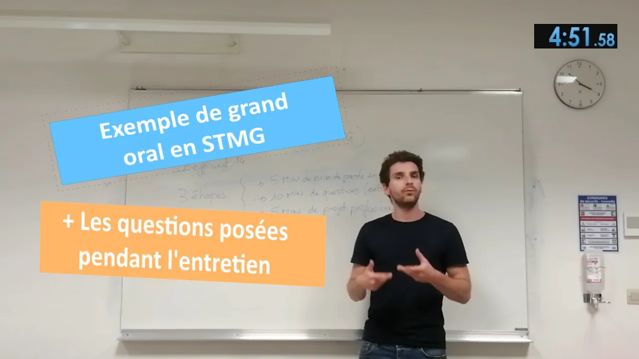 je retrousse aujourd'hui une petite vidéo pour vous présenter un exemple de grand oral en restait donc je vais vous montrer en particulier les cinq premières minutes 1 c'est-à-dire des cinq premières minutes vous parlez en continu devant le juge alors avant de vous montrer donc un exemple doctorale je vais vous rappeler déjà les principes de base sur cette épreuve donc je vous rappelle que c'est des poivres à nos visions de 14 et puis elle est découpée en trois parties vous avez en premier lieu cinq premières minutes vous allez parler en continu pour présenter votre problématique et