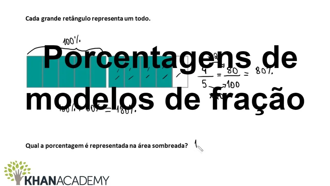 20 é igual a 80 então nós vamos ter 80 sobre 100 que é igual a 80% então na verdade quando a gente quer determinar porcentagem total aqui que está assombrada a gente precisa somar esses 100% já que esse daqui está completamente sombreado mas 80% já que esse aqui só está 80% sobrea dado então nós vamos ter algo igual a 180% e então qual é a porcentagem é representada na área sombreada 180% beleza e isso lembrando claro que cada retângulo representa 100%