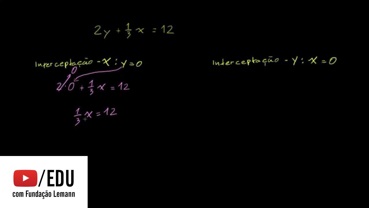 Portanto, a intersecção de y ocorre quando x é igual a 0. Para descobrir as intersecções, vamos estabelecer que y é igual a 0 nesta equação e descobrir o x, depois, estabelecer que x é igual a 0 e descobrir o y. Quando y igual a 0, como fica essa equação?