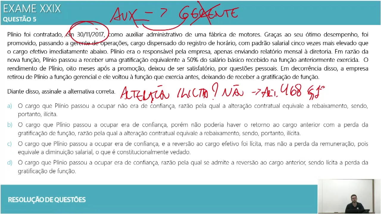 a questão cinco plínio foi contratado pós-reforma como auxiliar graças ao seu desempenho então ele era auxiliar e virou gerente ah tá em plena era responsável pela empresa apenas enviando relatório em razão da nova função plínio passou a receber gratificação e o rendimento de plínio oito meses após deixou de ser satisfatório por questões pessoais em decorrência a empresa retirou a função de plínio e ele voltou a função então plínio era auxiliar e virou gerente porém deixou de render tirar o cargo de gerente e voltou a ser auxiliar a questão é isto é uma alteração ilícita esta