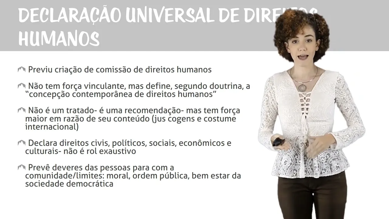 trouxe direitos civis políticos sociais econômicos e culturais mas não trouxe um rol exaustivo desses direitos ela Trouxe alguma previsão ali mas realmente ela por não ter força vinculante não foi um catálogo né dos direitos também ela prever os deveres das pessoas para com a comunidade então ela não estou trouxe direito mas também trouxe de ver porque a gente tem limite de ordem grau tenha todas as questões de ordem pública que tem que ser respeitadas e o bem-estar da sociedade democrática é importante a gente tem o que surgiu no contexto pós-segunda Guerra Mundial Então tinha muito