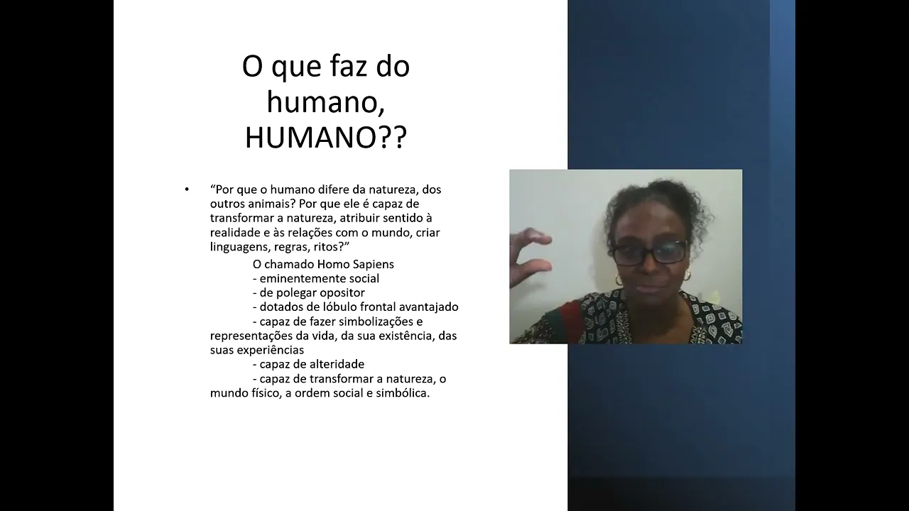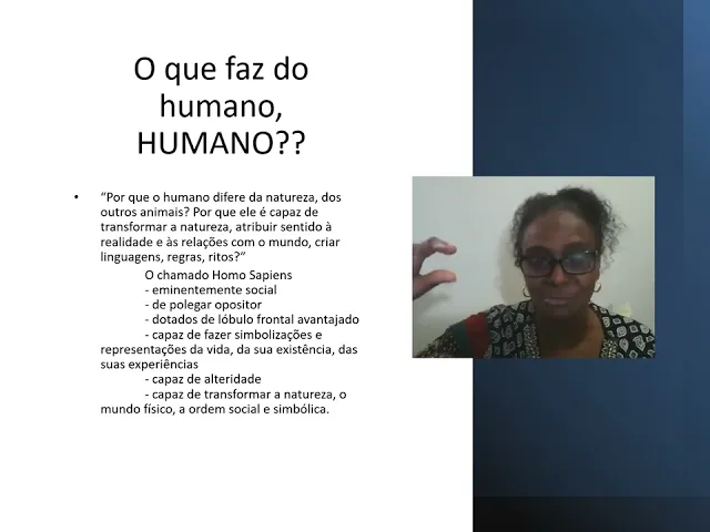 E e fica ocultado o papel desta a figura que é a figura do escravizador então quando a gente fala do escravizado implicitamente você já tá fazendo e colocações a colocação ué nós estamos falando de um ser humano lembra ser humano tavam de novo polegar Cadê o Polegar vão voltar aqui ó polegar opositor é capaz de fazer a pinça com lóbulo frontal avantajado capaz de fazer reflexões criar representações Simbólicas da realidade formula linguagem produzir a arte criar tecnologias o que transforma um mundo as suas relações e o faz pertencente a raça humana a raça humana e