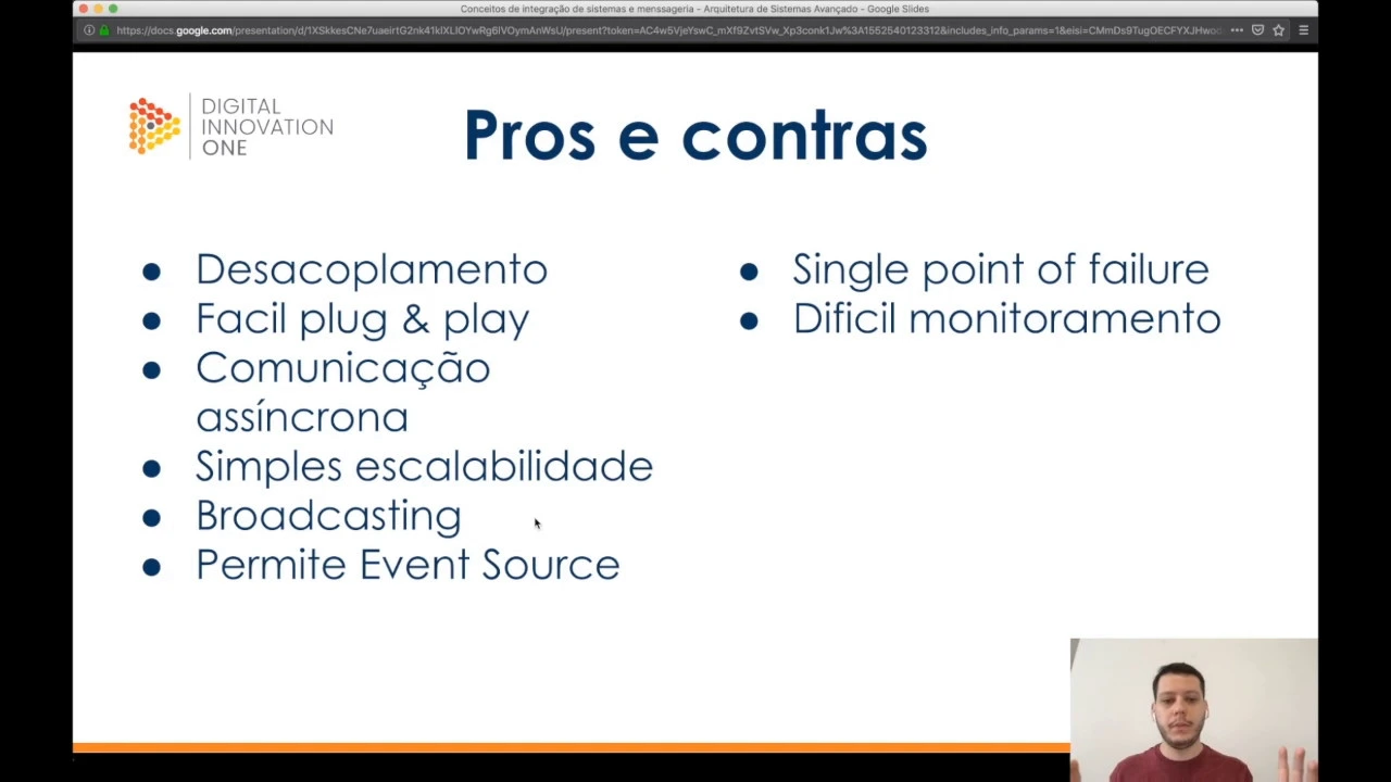 serviço de pagamentos por exemplo esse serviço pode sim estar interessado em ouvir qualquer mensagem de cadastro o usuário para tudo isso tinha um usuário cadastrado uma atualização o usuário informação cadastral usuário esse serviço pode crescer e ficar sabendo na hora de fazer uma cobrança poder colocar informações necessárias enfim esse é só um exemplo pode ter várias outras utilidades aqui o prós e contras a ter uma arquitetura mais ou menos com aquela que eu mostrei o mensageiro a grande vantagem é o complemento então ficou claro que eu tenho uma arquitetura isso não comunicam diretamente entre sí