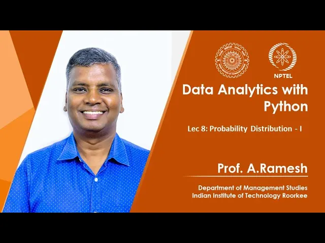 [Music] [Music] [Applause] [Music] [Applause] [Music] good morning students we are entering to the eighth lecture on this course that is a data analytics with the Python today the topic is probability distributions so what we are going to cover today it is very interesting topic we are going to see the some empirical distribution and its properties then discrete distribution in the discrete distribution we are going to see binomial paesan hyper geometric distributions the continuous distribution we are going to see the uniform exponential normal distributions first of all what is distribution what is the purpose of studying the distribution the distributions describes the shape of a batch of numbers there is a meaning of distribution okay suppose the different set of number is there you want to show what shape it follows whether it is a bell-shaped we can call it as a normal distribution if it is forming a rectangular shape we can call it as a uniform distributions like this that describes the shape of your batch of numbers the characteristics of the distribution can sometimes be defined as a small number of numerical descriptors called parameters so each distributions characteristics is expressed with the help of its parameters parameter is nothing but for example normal distribution it has two parameter one is mean and variance with the help of that you can draw the distribution that is a parameter y distribution can serve as a basis for standardized comparison of empirical distributions because if you want to compare with phenomena with your very standard distributions we can come to know that what distribution it follows then it will help you to estimate the confidence intervals for inferential statistics that will see what is the meaning of conference interval in coming classes then for me a basis for more advanced statistical methods for example fit between observed distribution and certain theory called distribution is an assumption of many statistical procedures suppose why we ought to study the distributions suppose if you are doing your simulation for example the arrival pattern follow a Poisson distributions suppose setup data you were collected if you prove that it is arrival follow Poisson distribution already there is a mean and variance in other population parameters already defined it if you're a natural phenomena you are able to compare with this standard distributions there are well-defined distribution parameter is there that parameter you can use as it is that is the purpose of studying the distribution then we will go for what is the random variable if you want to construct a distribution it is the relation between X and corresponding probability X comma P of X so here the X is nothing but random variable a variable which contains the outcome of a chance experiment is the random variable it is a kind of a quantifying the outcome suppose we're tossing a coin for X equal to 1 is getting hit 0 getting tails so 1 is nothing but here random variable so the X the X is the random variable that can take the value of 1 and 0 if the X well is 1 it is a head if the X 1 value 0 it is a tail a variable that it can take on different values in the population according to some random mechanism so the value of 1 and 0 it follow certain mechanism random variable can be a discrete it may be a distinct values countable for example here is a discrete random variable for example mass it is a continuous random variable then probability distributions the probability distribution function our probability density function PDF of a random variable X means the values taken by the random variable and their associated probabilities if you make a relation between X and corresponding probabilities P of X are f of X that if we plot that point that will form your distributions so PDF of your discrete random variable also known as p. m. of probability mass function example let the random variable X be the number of hits obtained in your two tosses of a coin there are two possibility when you toss two times two tosses first toss you may get hit second toss you may get hit then H thing tail telltale so these are the sample space probability density function of a discrete random variable suppose we are tossing a coin two times the probability of getting zero head is 1 by 4 the probability of getting 1 head is 1 by 2 the probability of getting two heads is 1 by 4 some should be 1 C in there in the x-axis the random variable is taken zero in y-axis corresponding probabilities marked so in x-axis random variable in y-axis corresponding probability this is called as the distributions now probability distribution for a random variable X we will do a small numerical problem a probability distribution for you a discrete random variable X is given so X is given corresponding probability distribution is given so this is an empirical distribution suppose if you want to know what is the probability of X less than or equal to 0 so what you have to do wherever random variable X is 0 and less than or equal to 0 you would add add that for example point D 0 plus point 1 7 plus 0.