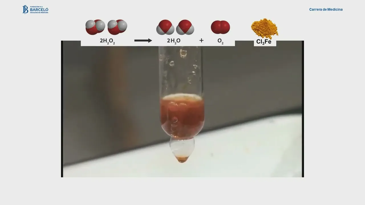 el residuo de cloruro férrico es decir que como sustancia en esta reacción no tuvo ningún tipo de participación de tipo estequiométrica es decir no hay una cantidad determinada ni de óxido de manganeso ni de cloruro férrico que fue necesario para que esta reacción se pusiera en evidencia otros digamos experimentos relacionados con la descomposición del agua oxigenada y en tal caso esta característica que comenzamos a observar de poder ver cómo el agua oxigenada acelera su descomposición en presencia de alguna sustancias en este caso lo que les muestro es el efecto de sales de hierro sobre una