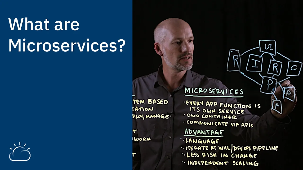 micro services architecture is where every application function is its own service deployed inside of a container environment they communicate via api's their language and framework independent we iterate at will through a devops pipeline this reduces some of the risk that we we see and then we can scale these components independently so thank you for your time today if you like to learn more and see more light boarding videos check us out on the IBM cloud blog
