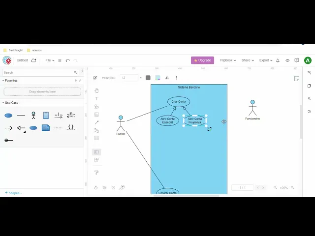 não vou ah colocar aqui por enquanto então criei aqui o meu sistema identifiquei meus atores agora vou fazer os meus relacionamentos mas antes disso eu vou colocar o meu primeiro caso então identifiquei que o meu primeiro caso aqui eu abrir uma conta então o que que eu faço você vem aqui ó clica nele né E você vai utilizar primeiro o verbo no infinitivo criar criar criar e aqui um uma palavra um substantivo né conta criar conta tá bom então Sempre é assim sempre verbo no infinitivo e depois não posso colocar só conta aqui é uma