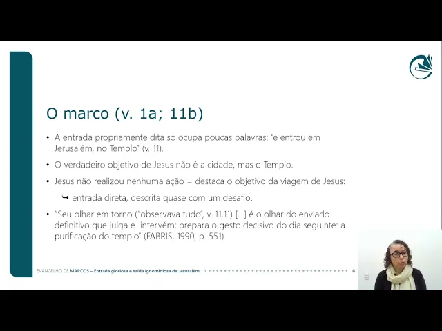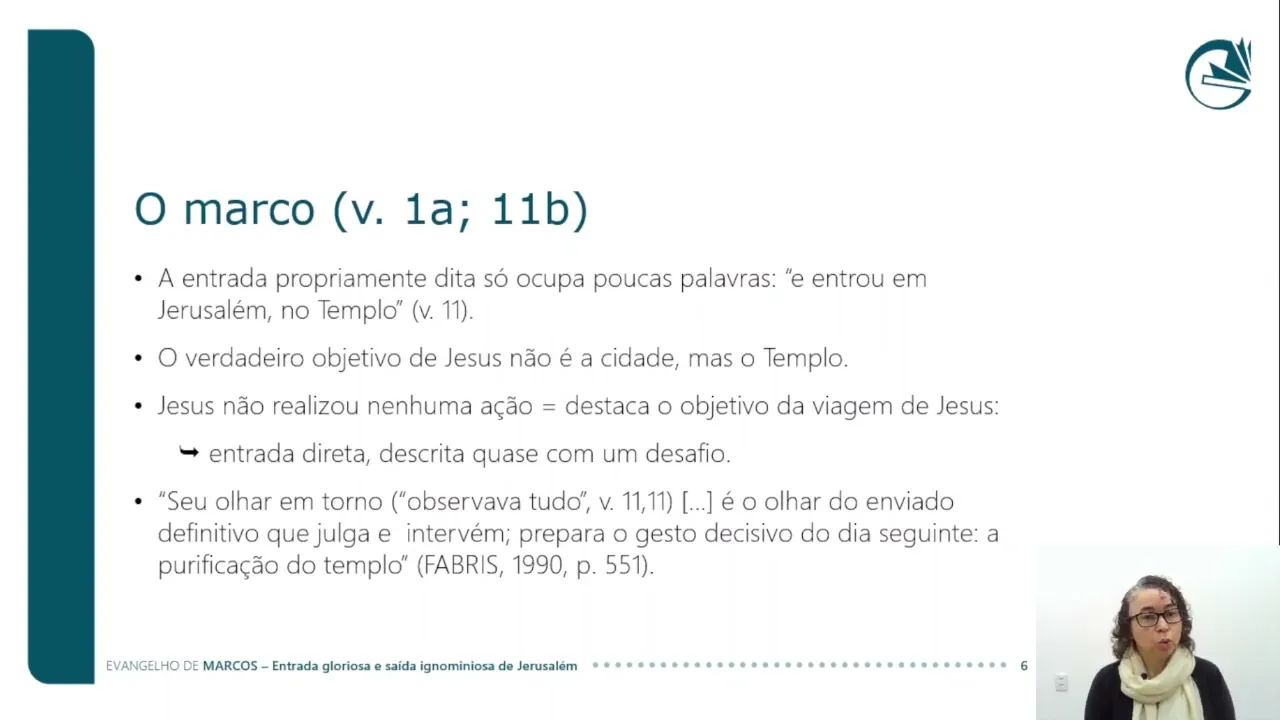 objetivo da viagem de Jesus que é justamente sua entrada no templo ele entra eh de forma direta quase como um desafio seu olhar em torno né ele observa tudo é o olhar do enviado definitivo que julga e intervém prepara o gesto decisivo do dia seguinte a purificação do tempo então essa Entrada Triunfal em Jerusalém eh quer justamente mostrar a entrada de Jesus no templo que vai preparar eh a narrativa seguinte que Jesus vai purificar esse templo para então começar a ensinar no templo de Jerusalém vamos agora à segunda perícope que é a saída ignominiosa de