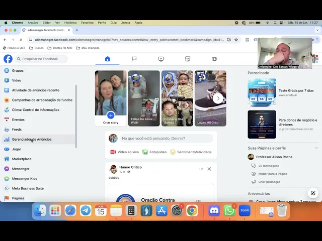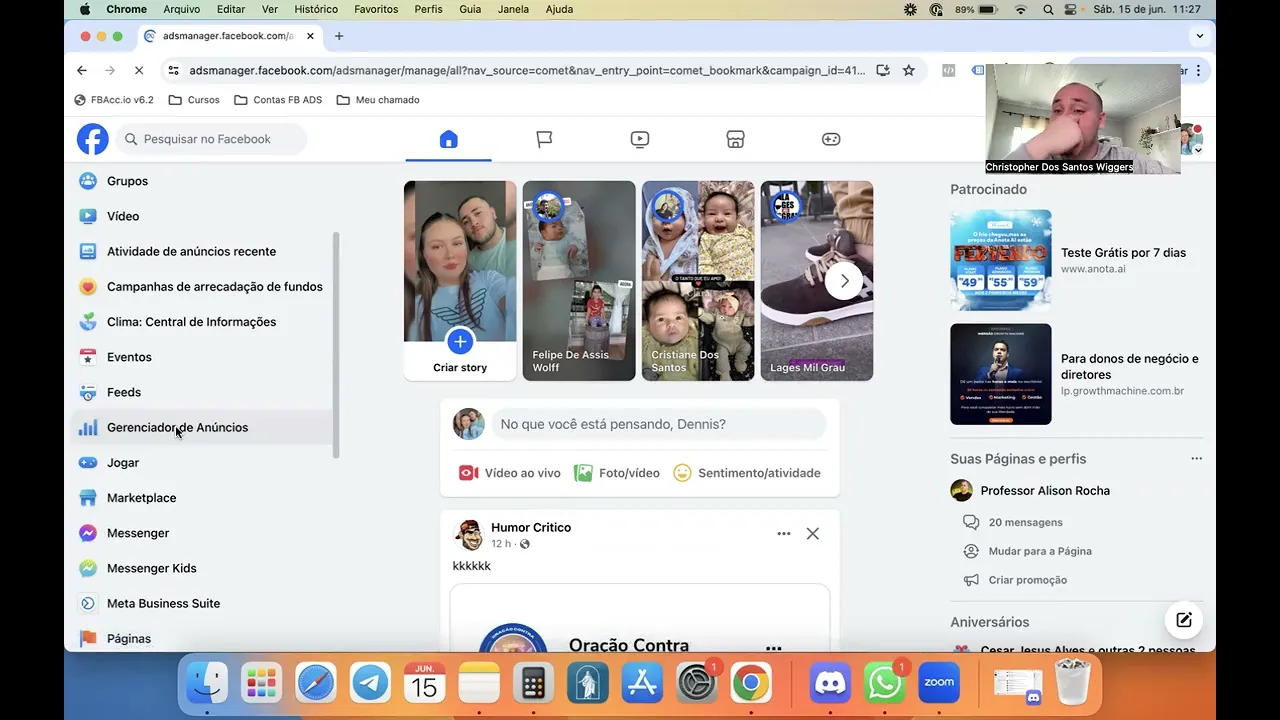 enquanto tá bom nós vamos precisar separar nossa conta de anúncios num portfólio Empresarial nós não queremos uma conta de anúncio pessoal eu pessoa física eu quero que a minha empresa a página que eu criei tenha uma conta de anúncio ten um fólio Empresarial dentro do Facebook e a minha conta de anúncios dentro dele porque é muito melhor quando você é uma empresa anunciando dentro do Facebook do que quando você é uma pessoa física anunciando dentro do Facebook tá bom então se vocês clicarem aqui gerenciador de anúncios tá ele vai te direcionar paraa sua conta de
