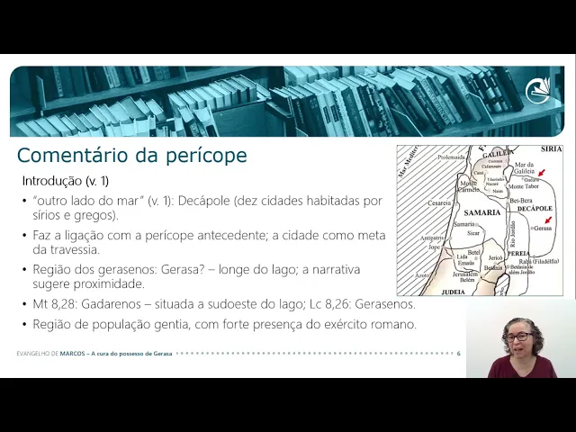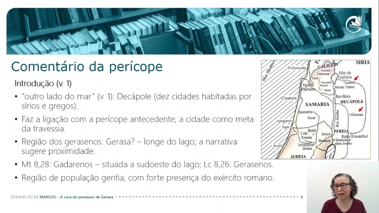 o o ponto importante aqui o ponto importante é que Jesus realiza esse esse milag milagre em uma região de população gentia com forte presença do exército romano Mas provavelmente também de alguns com a presença de alguns colonos judeus então o importante aqui ressaltar não é tanto saber se a cidade é gadara ou gerasa se perguntar se Marcos errou ou não não é a questão Histórica de realmente Onde aconteceu essa narrativa O importante aqui é ressaltar que Jesus está numa região pagã na decolle e que lá ele realiza esse milagre esse Exorcismo passem agora para a