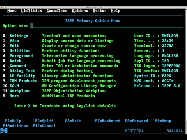 and making everything work the same way will rear its head in interesting ways here so first we'll log on in our 3270 terminal emulator vlog on to TSO the time sharing option which presents an interactive way to work with the mainframe instead of strictly through batch jobs that were submitted through card readers and Monroe logged-in will start up ispf the I think is the interactive system productivity facility so this is really a developer and system manager oriented tool to develop applications on the mainframe so this is PF product is what has the text editor for