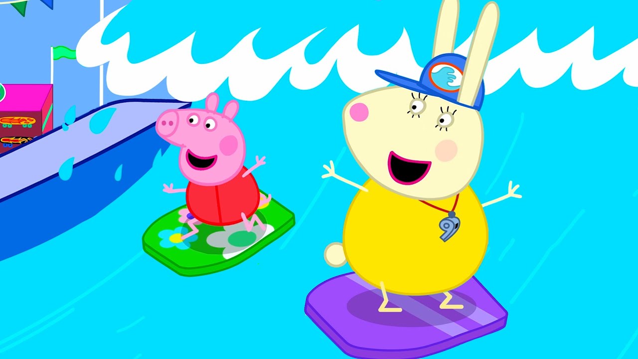 your turn Peppa yay put one foot on the board and push with the Other Well Done pepper and now try it with both feet on the board look at well done [Music] they are big children hey Peppa yo hello is that your skateboard it's my daddy's can you skate on it yes my daddy taught me he's the best skateboarder in the world well I suppose I am a bit of an expert at it really so what do you make of these ramps [Music] [Music] are very good at skateboarding would you like to try yes but