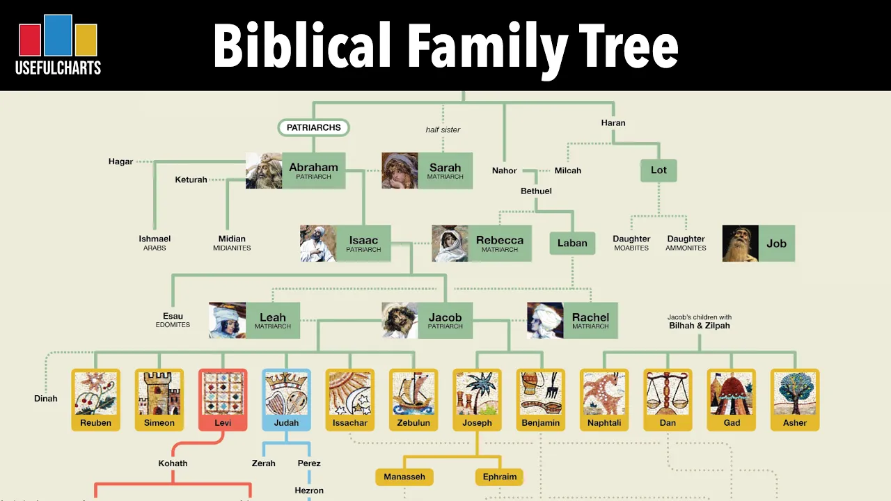 hi this is Matt Baker today I'm going to show you the entire family tree of the Bible all the way from Adam and Eve to the time of Jesus I have done previous videos featuring various sections of this tree but I've never done the whole thing in a single video so that's what I'm going to do today and I'll be using the new version of our Biblical family tree chart which is now available as a poster from our website usefulcharts. com this version includes a lot of new features so I'll be highlighting them along the way [Music] thank you [Music] at the top of the tree is of course Adam and Eve who according to the Bible were the first two humans created by God their first two children were named Cain and Abel but as you probably know Cain kills Abel out of jealousy and therefore Adam and Eve have a third son named Seth and it is through Seth that the biblical story continues now in a previous video I got a lot of questions about who Seth married in order to have his children well according to the Bible Adam and Eve had many other Sons and Daughters even though they aren't named So based on tradition the assumption is that Seth would have married one of his sisters and that subsequent Generations would have married their cousins and so on now I should point out that in this video I'm not going to be discussing whether or not the early parts of this tree are literary or literal history I'll leave that decision up to you if you want to hear my take I'll link to some previous videos in the description where I do dive into that but in this video I'm just going to follow the tree as it is described in the Bible so Seth has a son named enosh and then Seven Generations later we get the next main character in The Bible Noah Noah's the one who built the ark and filled it up with animals in order to escape the great flood at this point everyone on Earth dies except for Noah and his wife and their three sons and their wives so there are eight people in total who then go on to repopulate the Earth the Bible doesn't mention the name of Noah's wife or his daughters-in-law but we do know that his three sons were named Shem ham and jeffith Shem has five Sons ham has four and jeffith has seven for a total of 16 grandsons for Noah in most cases the names of these 16 grandsons match the names of Nations that would eventually form in the near East such as Asher which corresponds to Assyria misrium which corresponds with Egypt and Javen which corresponds to Greece but it is in the line of shem's son arfakshad that the Bible focuses on he has a son named Salah who has a son named Eber which is perhaps the basis for the word Hebrew five generations down from Eber we get a man named Tara who lives in Mesopotamia which is modern-day Iraq and he has three sons named Abraham nahor and haran haran dies in Mesopotamia and sometime after this the rest of the family including haran's son lot decides to move to the land of Canaan which God had promised to Abraham and his descendants Kanan basically corresponds to modern-day Israel and Palestine Tara dies along the way in Syria and this is where nahor decides to settle however Abraham and lot continue on to Canaan Abraham's main wife was a woman named Sarah and eventually we learned that she is also his half-sister so presumably she was a child of Terror through a different mother Sarah has trouble having a child so she gets Abraham to marry her servant Hagar who gives him a son named Ishmael but eventually Sarah has a son as well miraculously at age 90. that sign is named Isaac and becomes Abraham's main Heir after Sarah dies Abraham then marries for a third time to a woman named Keturah and they have several Sons one of whom is named Midian Isaac ends up marrying Rebecca who is the granddaughter of nahor and thus is his first cousin once removed together they have two sons Jacob and Esau Jacob whose name is later changed to Israel becomes the progenitor of the Israelites which is why Abraham Isaac and Jacob are known as the three Patriarchs or fathers however before we look at the Israelites let me point out some other people groups who according to the Bible were distantly related to them later once the kingdoms of Israel and Judah are established their closest neighbors will be the kingdoms of Moab Ammon and Edom according to the Bible the moabites and the ammonites are the descendants of lot whereas the are the descendants of Esau further south are the midianites who as you probably guessed are the descendants of media and then below them are the Arabs who are the descendants of Ishmael According to Islamic tradition Muhammad is a descendant of Abraham's son Ishmael whereas Jesus is a descendant of Abraham's son Isaac which is why Judaism Christianity and Islam are known as abrahamic religions I should also point out job at this point the Bible is not clear on exactly how he connects to the tree although he is generally thought to fit in sometime during the period of the Patriarchs okay let's now look at Jacob and his 12 sons Jacob marries two sisters Leia and Rachel who are the daughters of Rebecca's brother Laban this makes Laban his uncle and his two wives his first cousins he also has children with Leia and Rachel's two servants bilha and zilpa each of Jacob's twelve Sons becomes the progenitor of one of the Twelve Tribes of Israel out of the twelve the two most important end up being Levi and Judah which is why they get special colors so note that from this point onwards red is used for the tribe of Levi blue for the tribe of Judah and yellow for all the other tribes however before we move on I should point out Joseph the firstborn of Jacob's favorite wife Rachel he's the one who is sold by his brothers and then winds up in Egypt where he becomes second in command under the Pharaoh the Bible doesn't tell us the name of that Pharaoh but the context suggests that the Joseph story might be connected to the 15th dynasty of Egypt which is when a Semitic group known as th