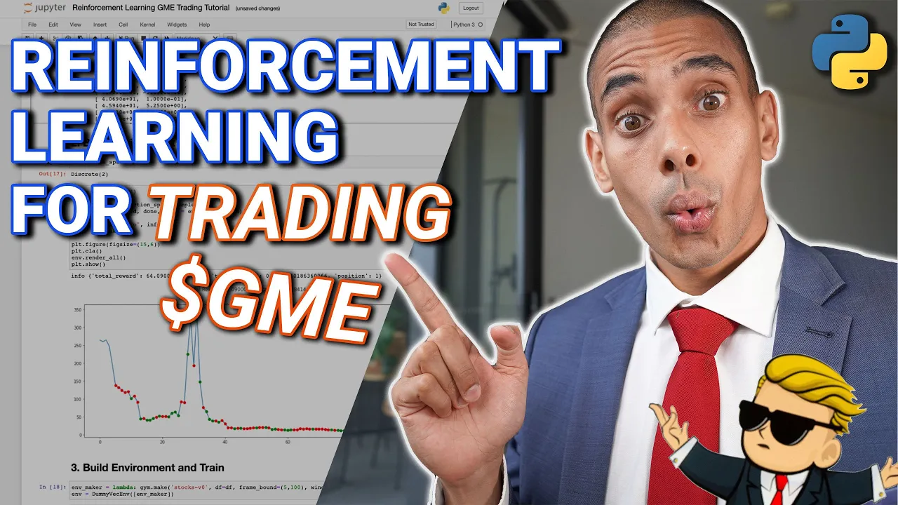 what's happening guys my name is nicholas renate and in this video we're going to be using reinforcement learning for trading and hopefully we can try to make a couple of bucks of gme in the process let's take a deeper look as to what we'll be going to so this video is really going to be focused on using reinforcement learning to help us out with trading now i mentioned jme but this could just as easily be used with different stocks forex whole bunch of different equities and other types of securities as well so in terms of what we're going to be covering we're going to be using the open ai gym any trading environment so this is a custom trading environment that you can use to trade a whole bunch of different types of securities what we're then going to do is we're going to build a custom training bot using reinforcement learning and specifically we're going to do that using the stable baselines package which is just a really great package to get started with reinforcement learning really really quickly then what we're going to do is load in gme trading data into our trading environment so hopefully our reinforcement learning agent is able to learn how to trade that particular stock let's take a look as to how this is all going to fit together so first up as i said we're going to be using the any trading open ai gym environment so this just makes it easier to build a custom trading environment we'll then load in our gme price data that we've got from marketwatch and this will be available in the github description below as will all the code and then we're going to train a reinforcement learning bot to try to trade against that particular environment ideally trying to make additional profit on top of our portfolio ready to do it let's get to it alrighty so in order to get started with reinforcement learning for trading there's going to be five key things that we need to do so first up what we need to do is install and import our dependencies and really we're going to be relying on the jim any trading environment there as well as stable baselines then we're going to want to bring in some market watch gme data so specifically gamestop data and again in this case we're going to be using daily data but if you could get minute data or even second data that's probably going to give you a much more sophisticated model ideally the data that you use should mimic the frequency that you want to be trading at so once we've done that we're then going to build up our environment and this is specifically going to give us a trading environment that allows us to work with open ai gym now in this case the environment that we're going to be using is called gym dash any trading and it allows you to pass through a whole bunch of different types of data so say for example you didn't want to do it on gme you wanted to do it on amc or if you wanted to do it on bitcoin or ethereum or a different cryptocurrency you could actually do that simply by passing through different reference data to any trading environment which is actually pretty cool once we've got our environment built we're then going to train our reinforcement learning model and specifically for that we're going to be using stable baseline so this is a great reinforcement learning package which i've recently discovered that allows you to do a whole bunch of sophisticated stuff reasonably easily and then we're going to test it out so we'll train on for example 50 to 100 days of data and then we'll test it out on the next 10 days now again all the code here is shown for demonstration only so if you are going to deploy this please do your own research and it's not meant to be financial advice all righty first things first let's go on ahead and install and import our dependencies alrighty before we go on ahead and run that let's take a look at the line that we've written so in order to install stuff from within our jupyter notebook we're just going to pass through an exclamation mark then pif install and then followed by all the different packages that we want to install so the first one that we want to install is tensorflow gpu and specifically we want to install version 1. 15 because stable bass lines only works with tensorflow versions below version two as at this point in time so we're going to be leveraging those versions of tensorflow so tensorflow dash gpu equals equals 1. 15.