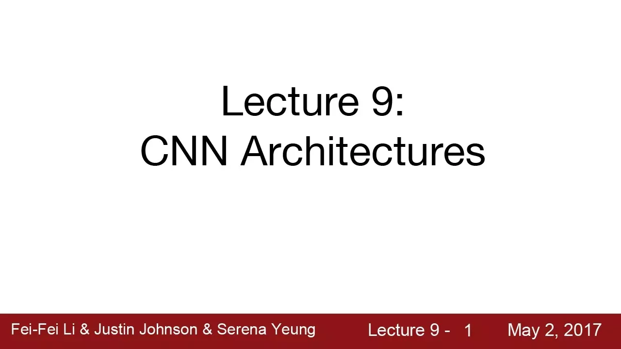 - All right welcome to lecture nine. So today we will be talking about CNN Architectures. And just a few administrative points before we get started, assignment two is due Thursday. The mid term will be in class on Tuesday May ninth, so next week and it will cover material through Tuesday through this coming Thursday May fourth. So everything up to recurrent neural networks are going to be fair game. The poster session we've decided on a time, it's going to be Tuesday June sixth From twelve to three p.m. So this is the last week of classes. So